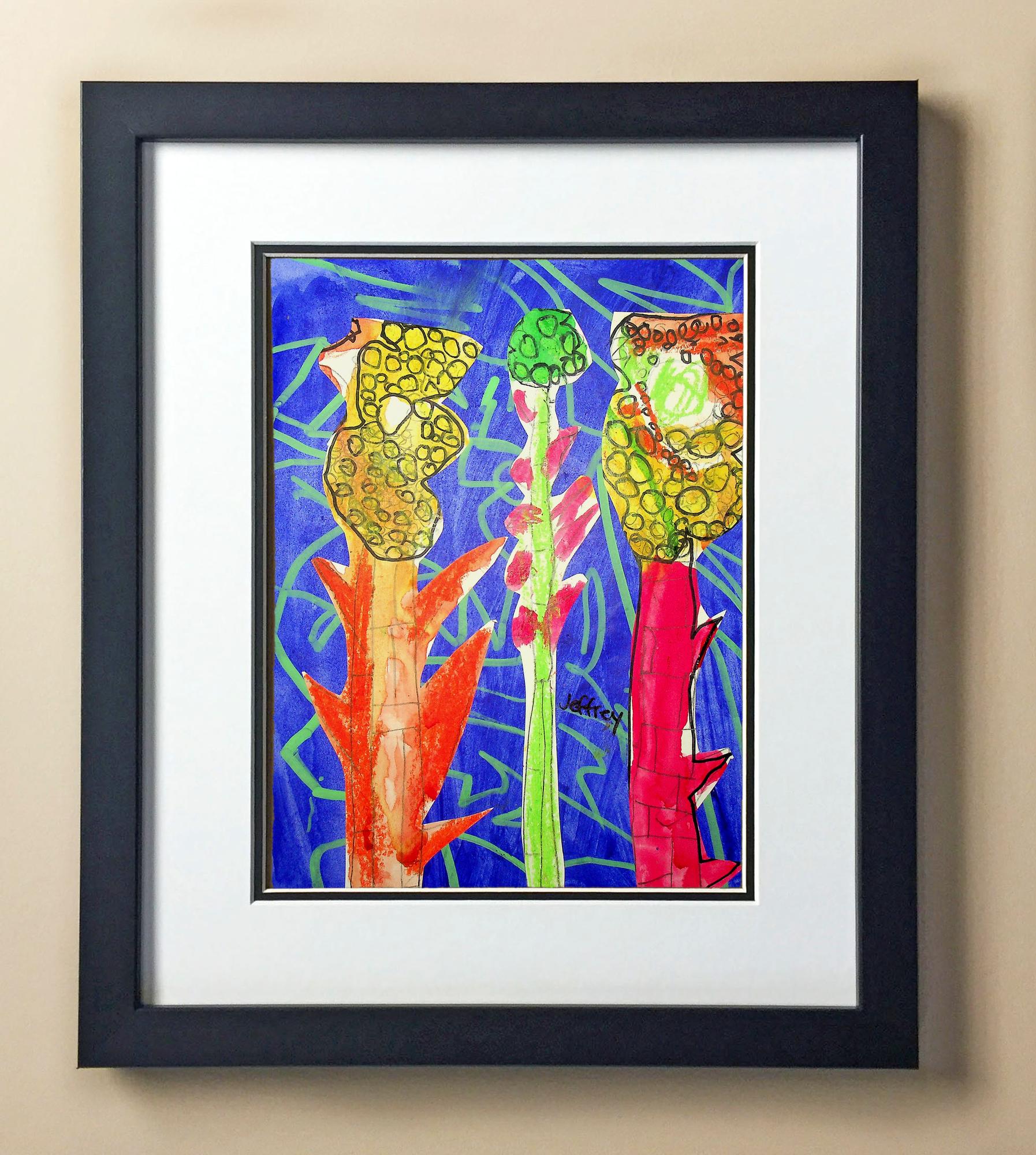 Included with the purchase is the Students Artwork, Frame, double matboard, shatter proof plexiglass, and a ready to hang backerboard with turnbuttons