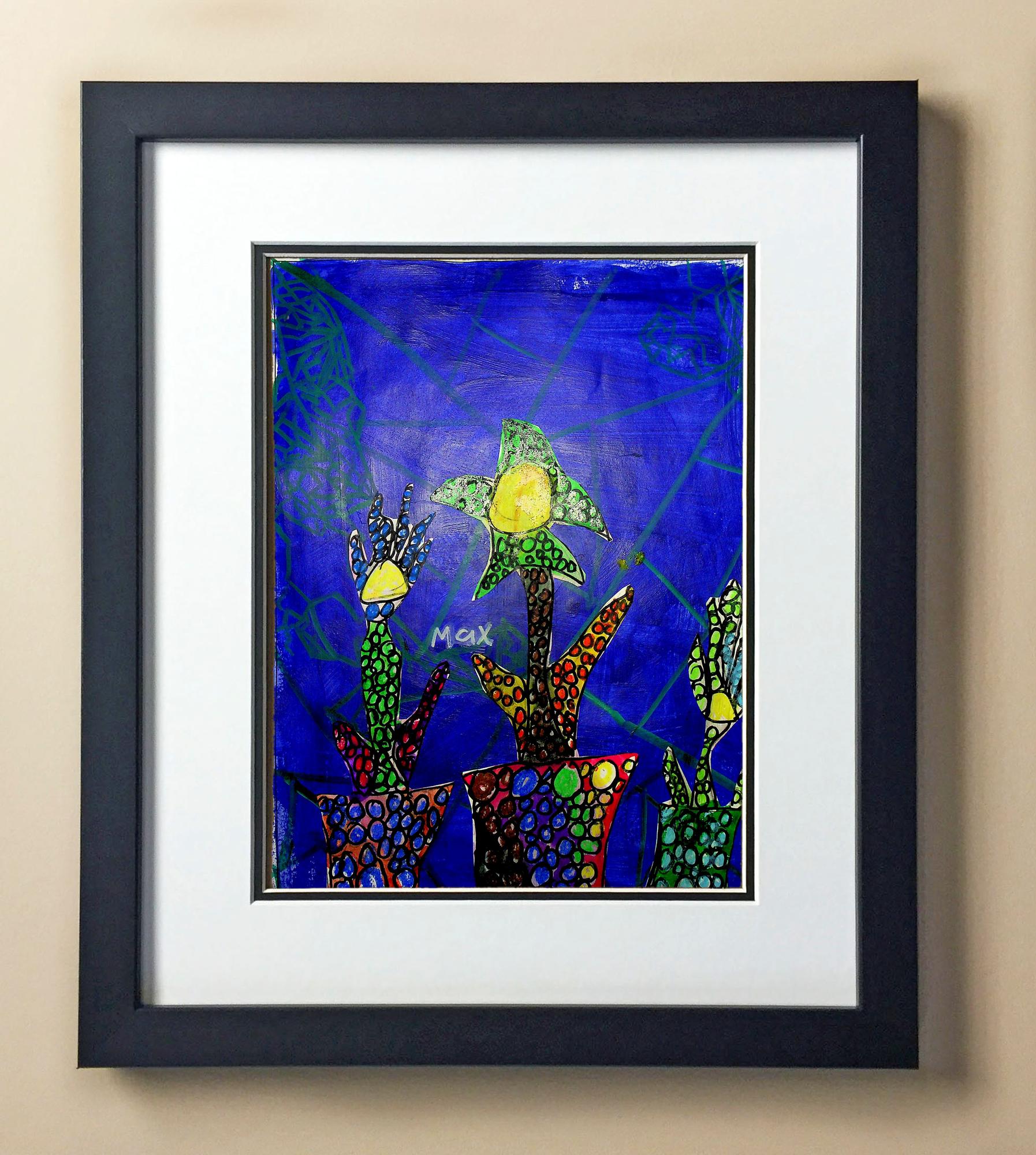 Included with the purchase is the Students Artwork, Frame, double matboard, shatter proof plexiglass, and a ready to hang backerboard with turnbuttons