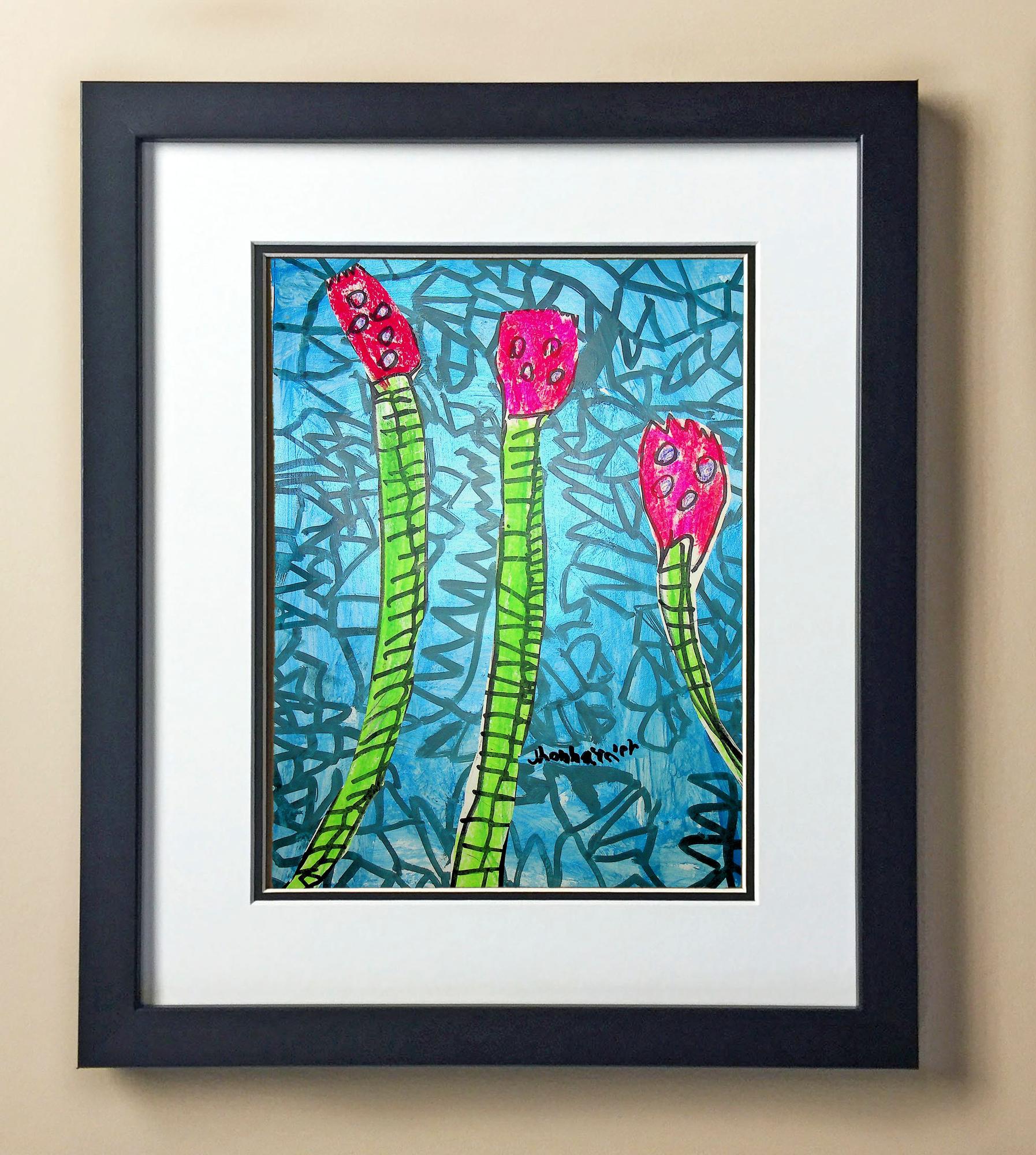 Included with the purchase is the Students Artwork, Frame, double matboard, shatter proof plexiglass, and a ready to hang backerboard with turnbuttons