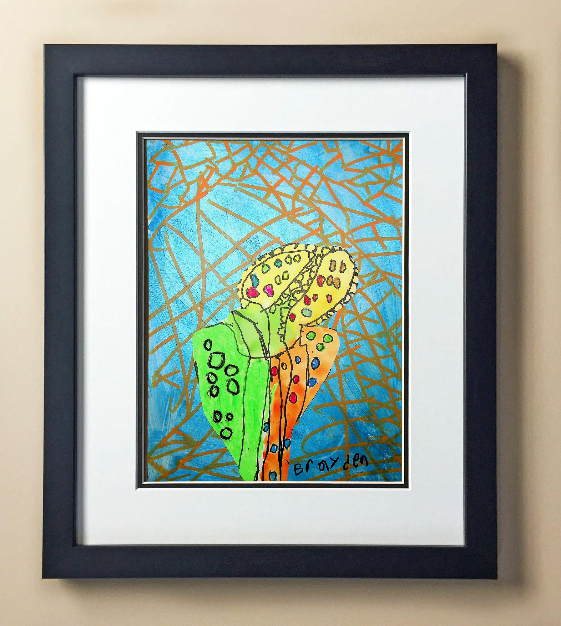 Included with the purchase is the Students Artwork, Frame, double matboard, shatter proof plexiglass, and a ready to hang backerboard with turnbuttons