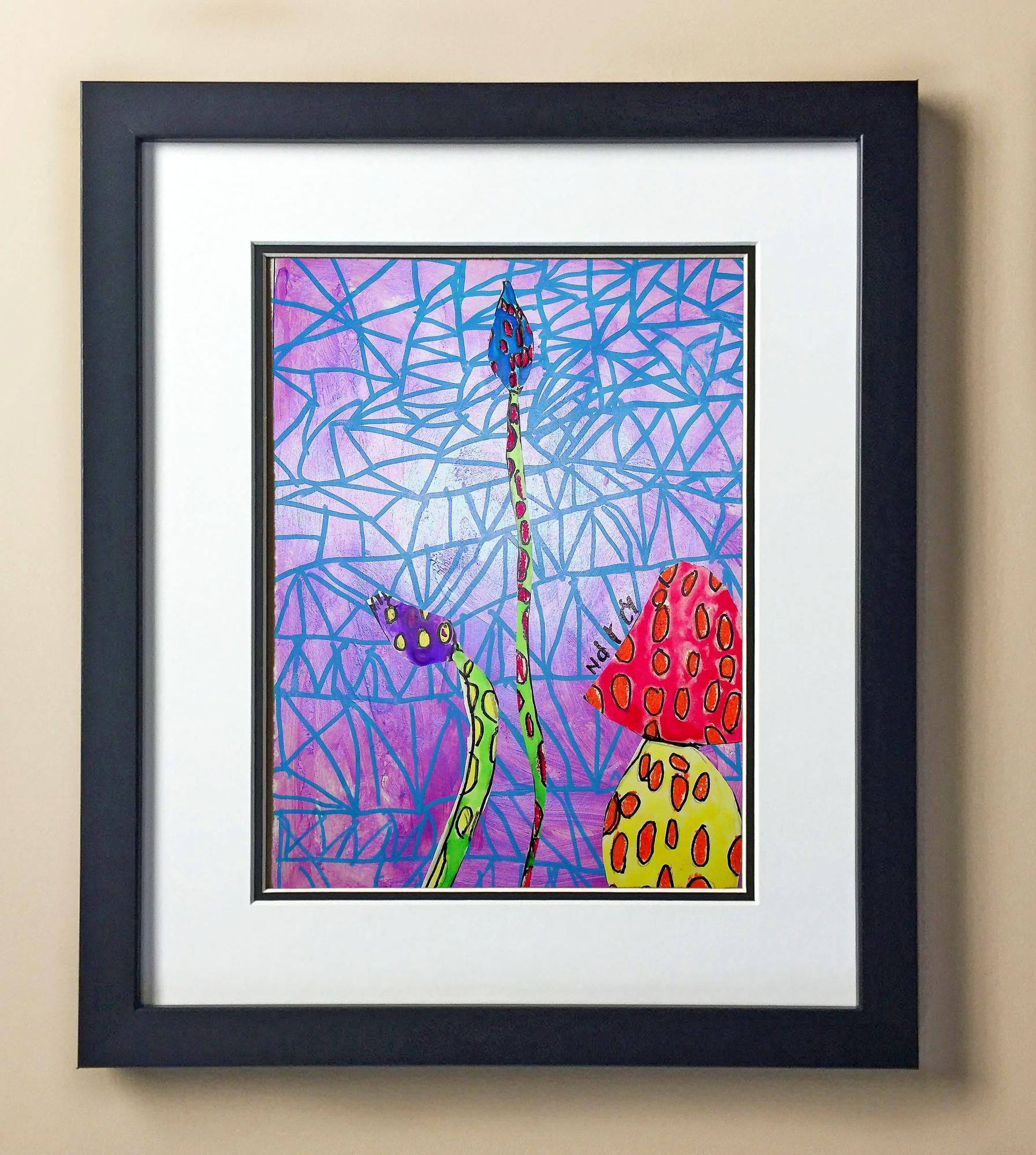 Included with the purchase is the Students Artwork, Frame, double matboard, shatter proof plexiglass, and a ready to hang backerboard with turnbuttons