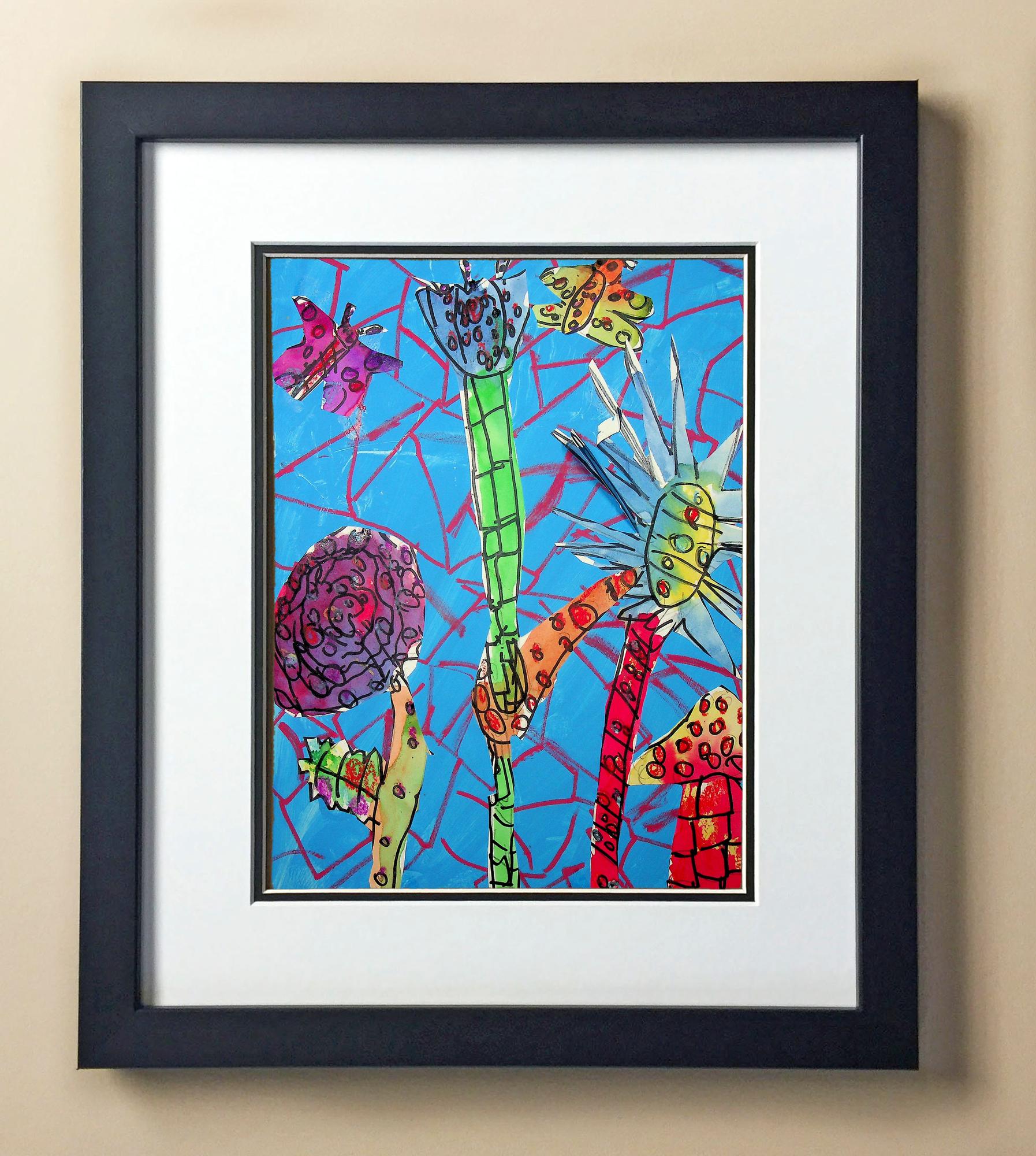 Included with the purchase is the Students Artwork, Frame, double matboard, shatter proof plexiglass, and a ready to hang backerboard with turnbuttons