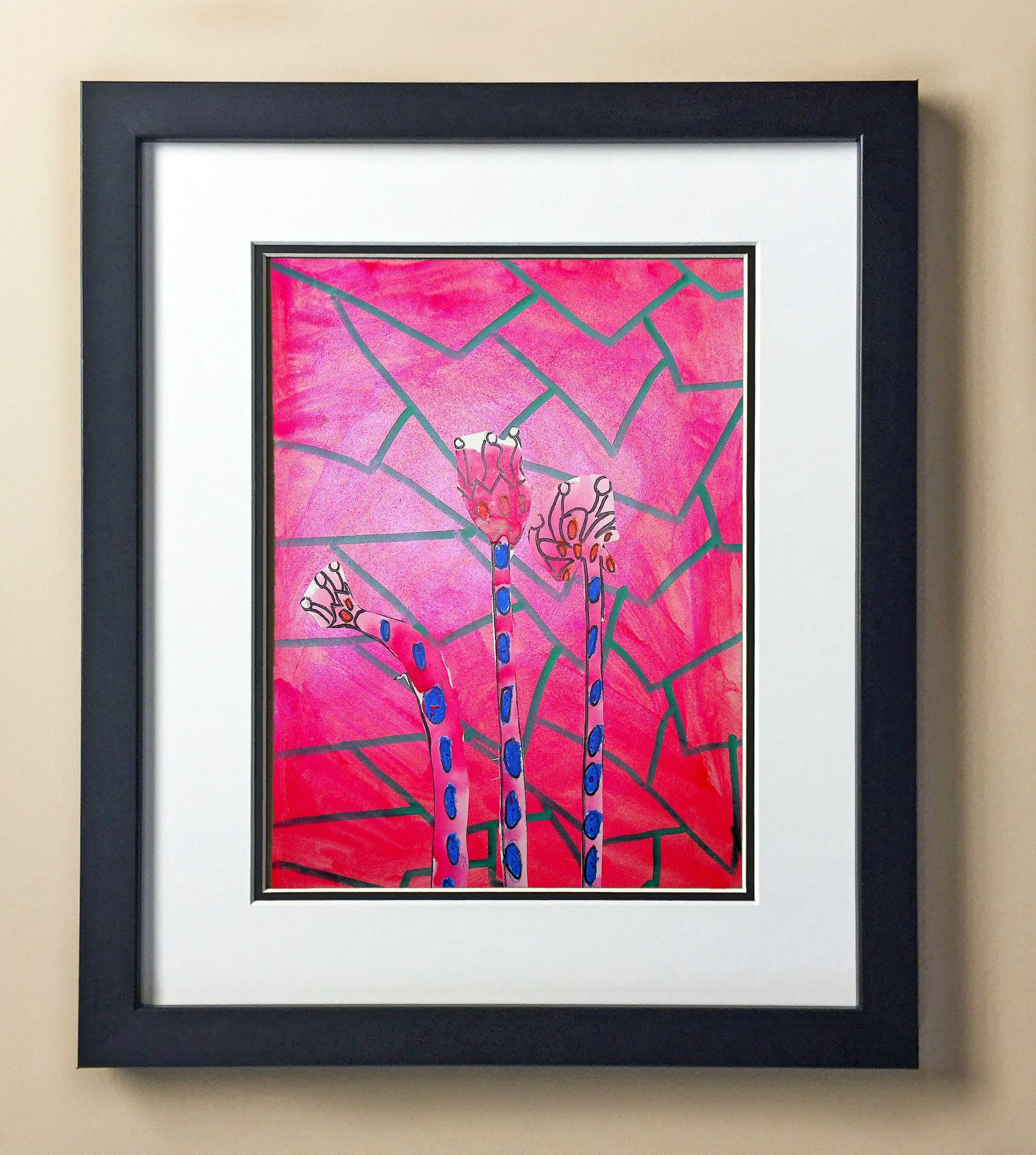 Included with the purchase is the Students Artwork, Frame, double matboard, shatter proof plexiglass, and a ready to hang backerboard with turnbuttons