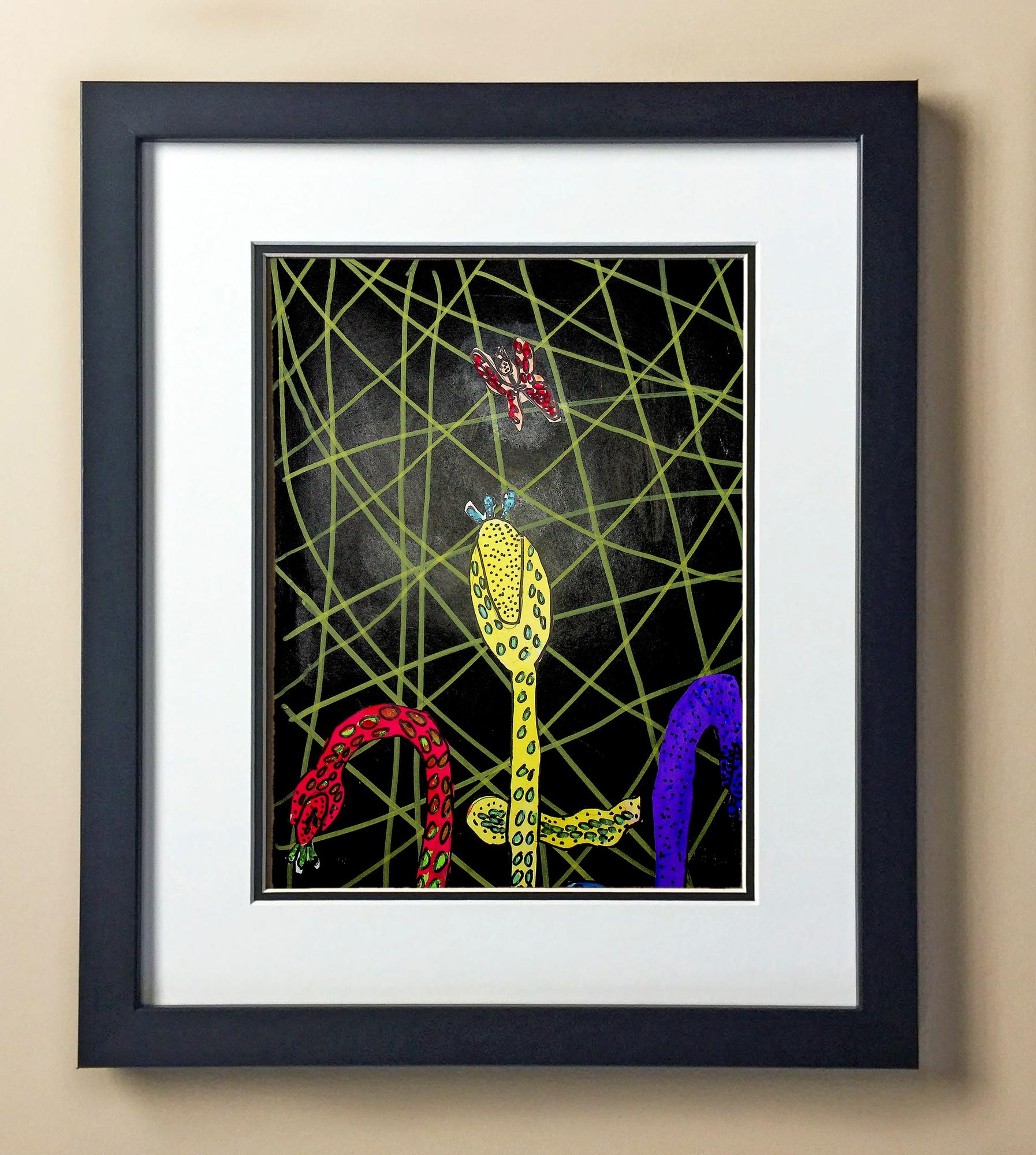 Included with the purchase is the Students Artwork, Frame, double matboard, shatter proof plexiglass, and a ready to hang backerboard with turnbuttons