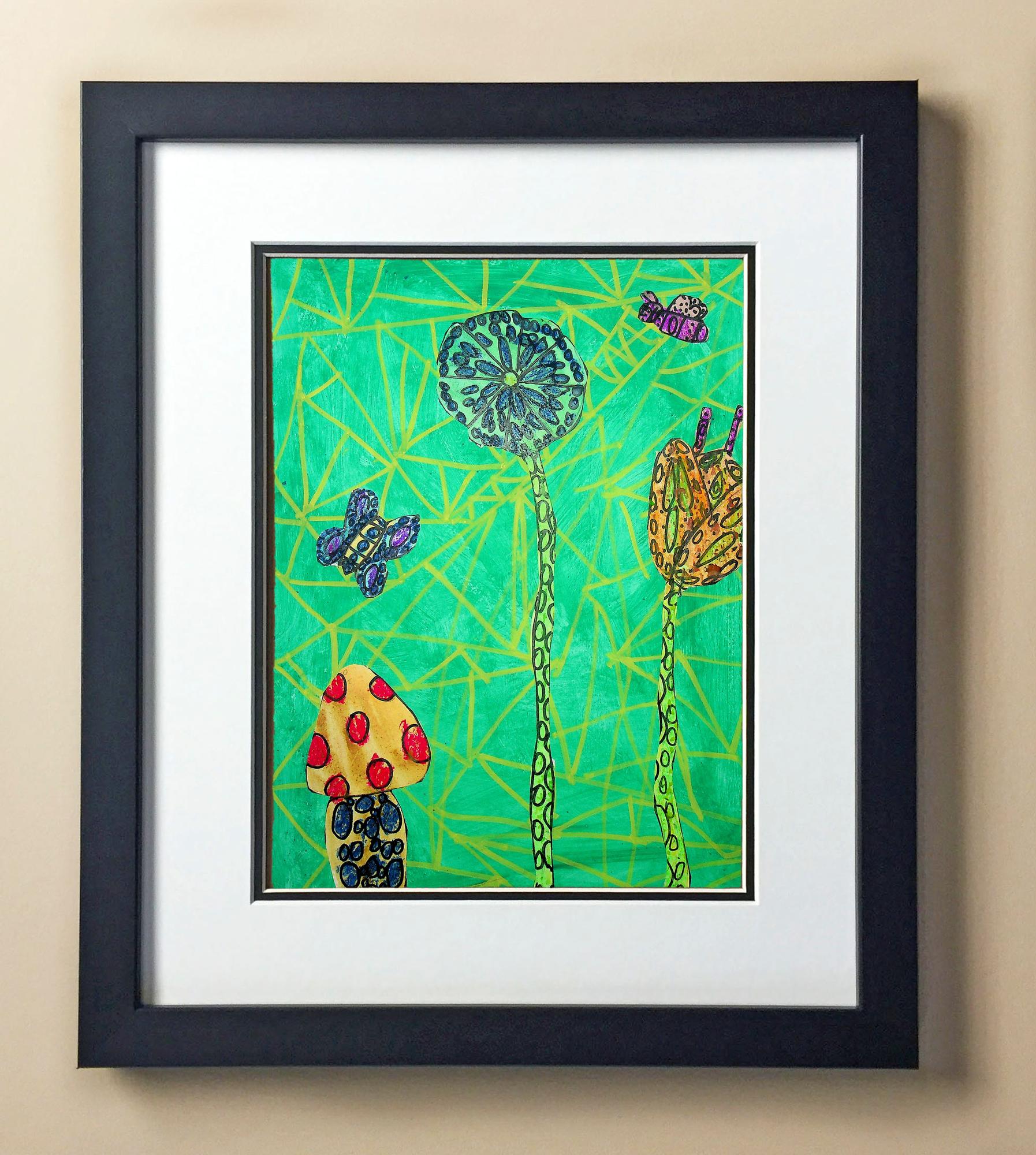 Included with the purchase is the Students Artwork, Frame, double matboard, shatter proof plexiglass, and a ready to hang backerboard with turnbuttons