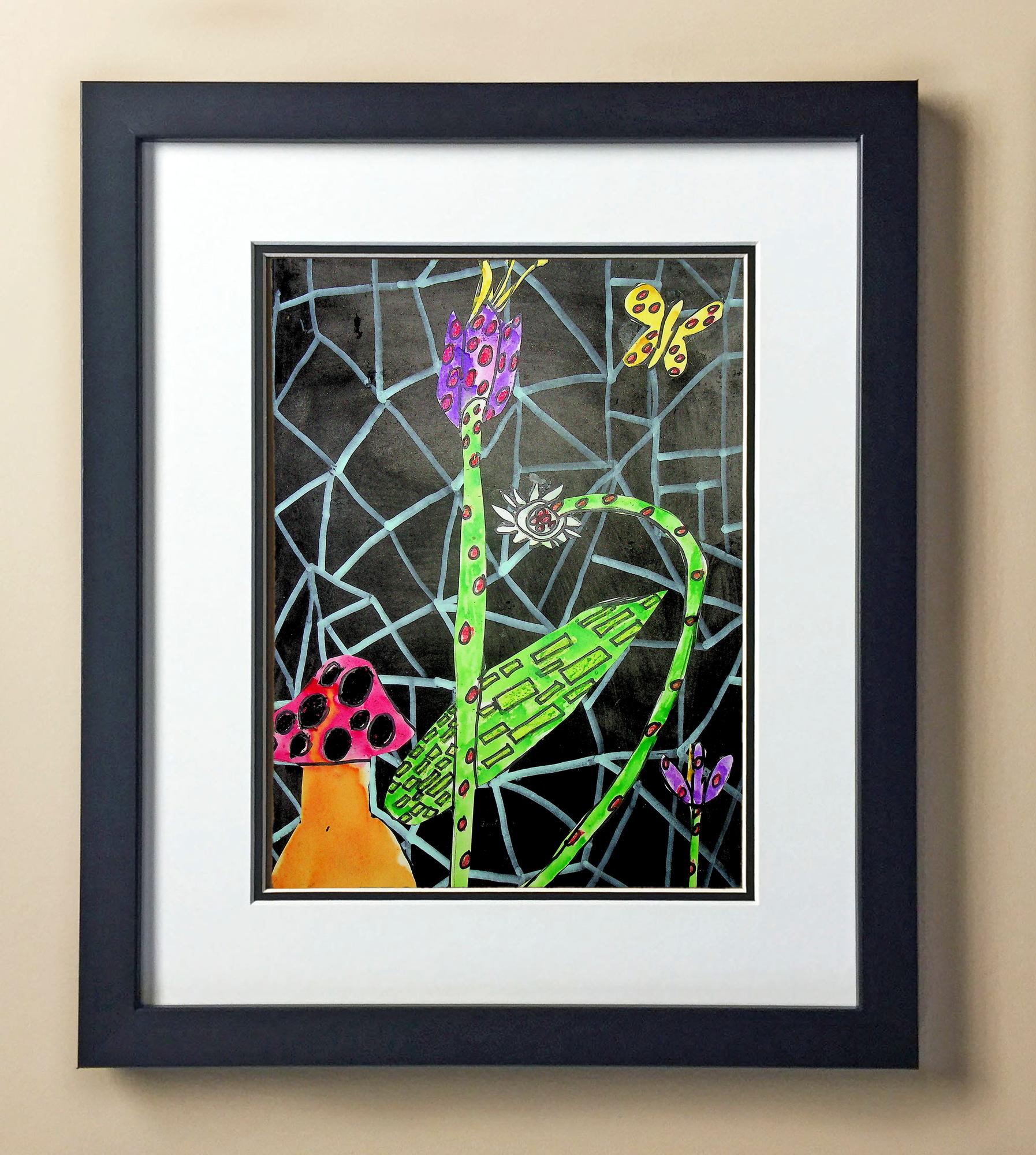 Included with the purchase is the Students Artwork, Frame, double matboard, shatter proof plexiglass, and a ready to hang backerboard with turnbuttons