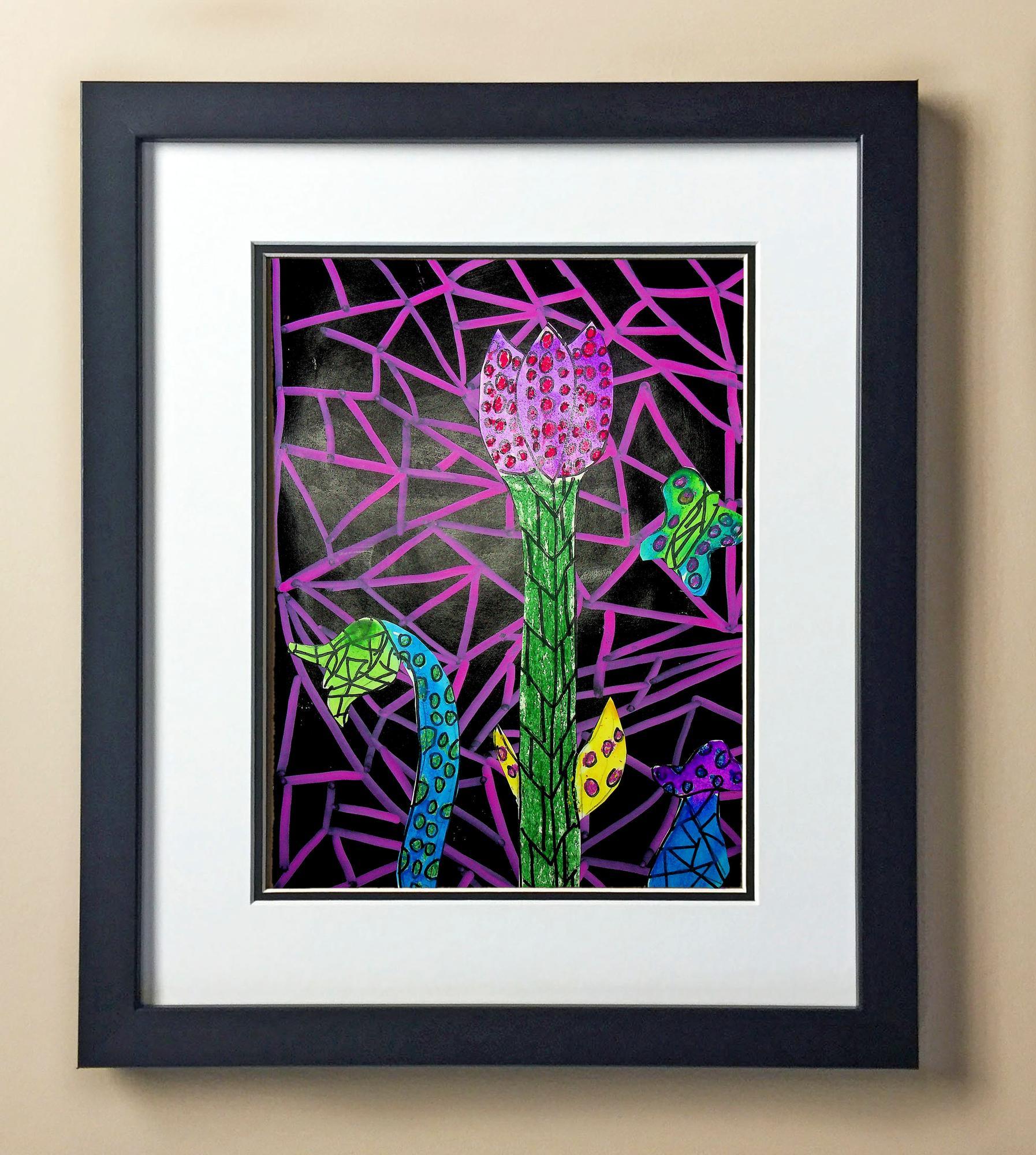 Included with the purchase is the Students Artwork, Frame, double matboard, shatter proof plexiglass, and a ready to hang backerboard with turnbuttons