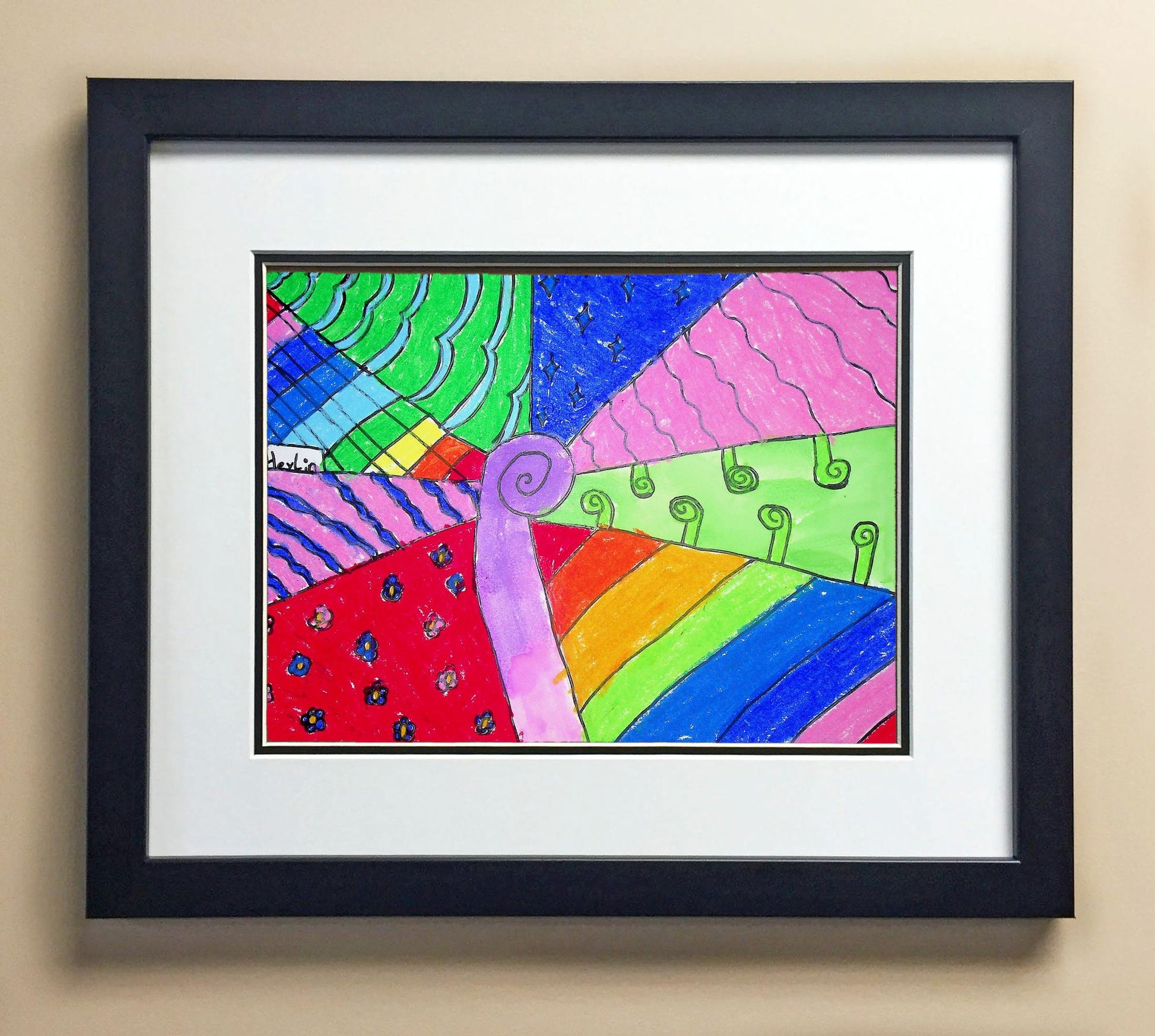 Included with the purchase is the Students Artwork, Frame, double matboard, shatter proof plexiglass, and a ready to hang backerboard with turnbuttons