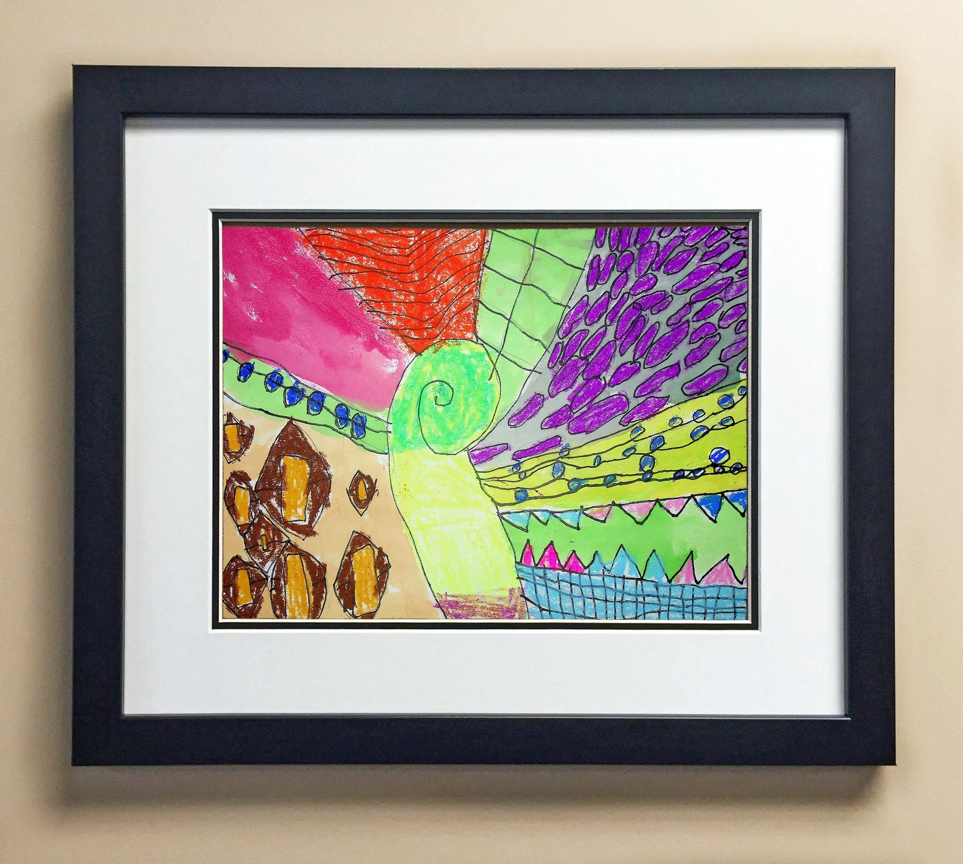 Included with the purchase is the Students Artwork, Frame, double matboard, shatter proof plexiglass, and a ready to hang backerboard with turnbuttons
