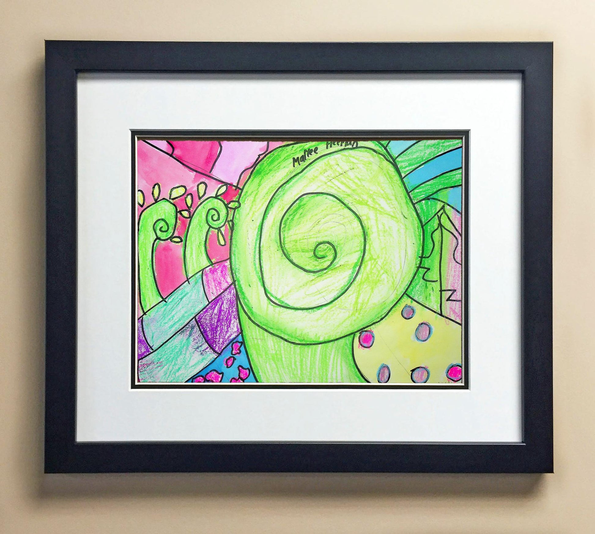 Included with the purchase is the Students Artwork, Frame, double matboard, shatter proof plexiglass, and a ready to hang backerboard with turnbuttons