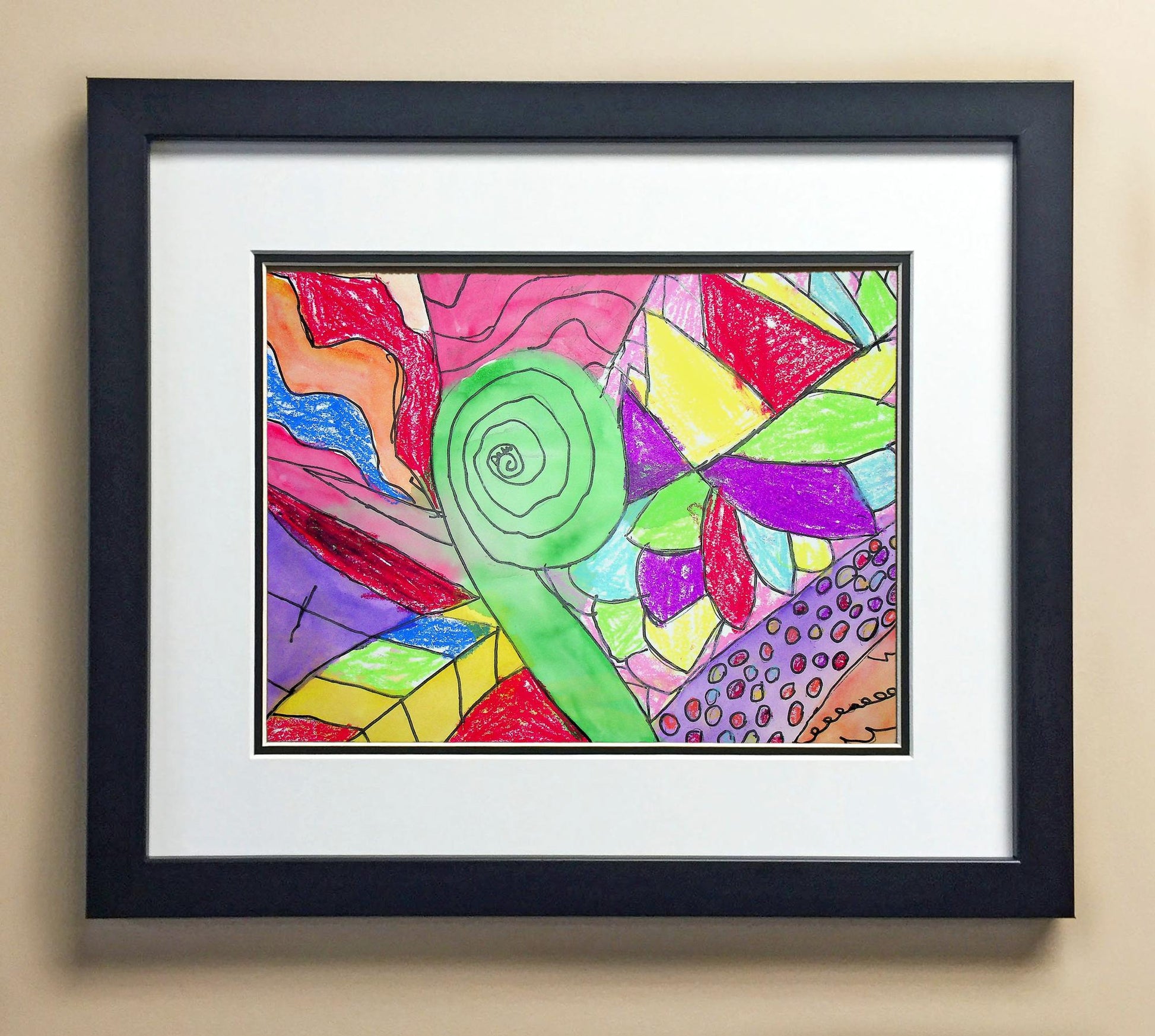Included with the purchase is the Students Artwork, Frame, double matboard, shatter proof plexiglass, and a ready to hang backerboard with turnbuttons