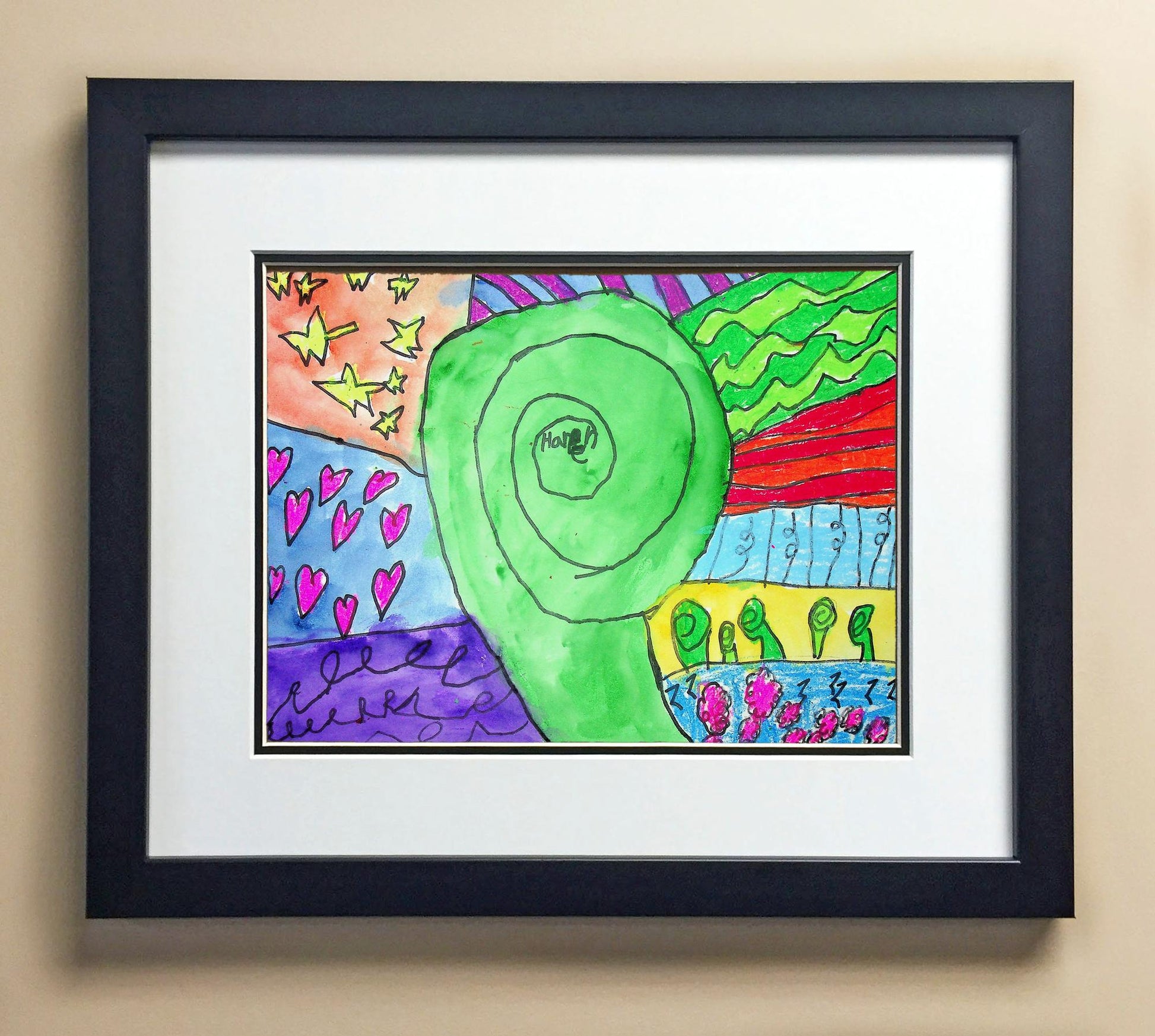 Included with the purchase is the Students Artwork, Frame, double matboard, shatter proof plexiglass, and a ready to hang backerboard with turnbuttons