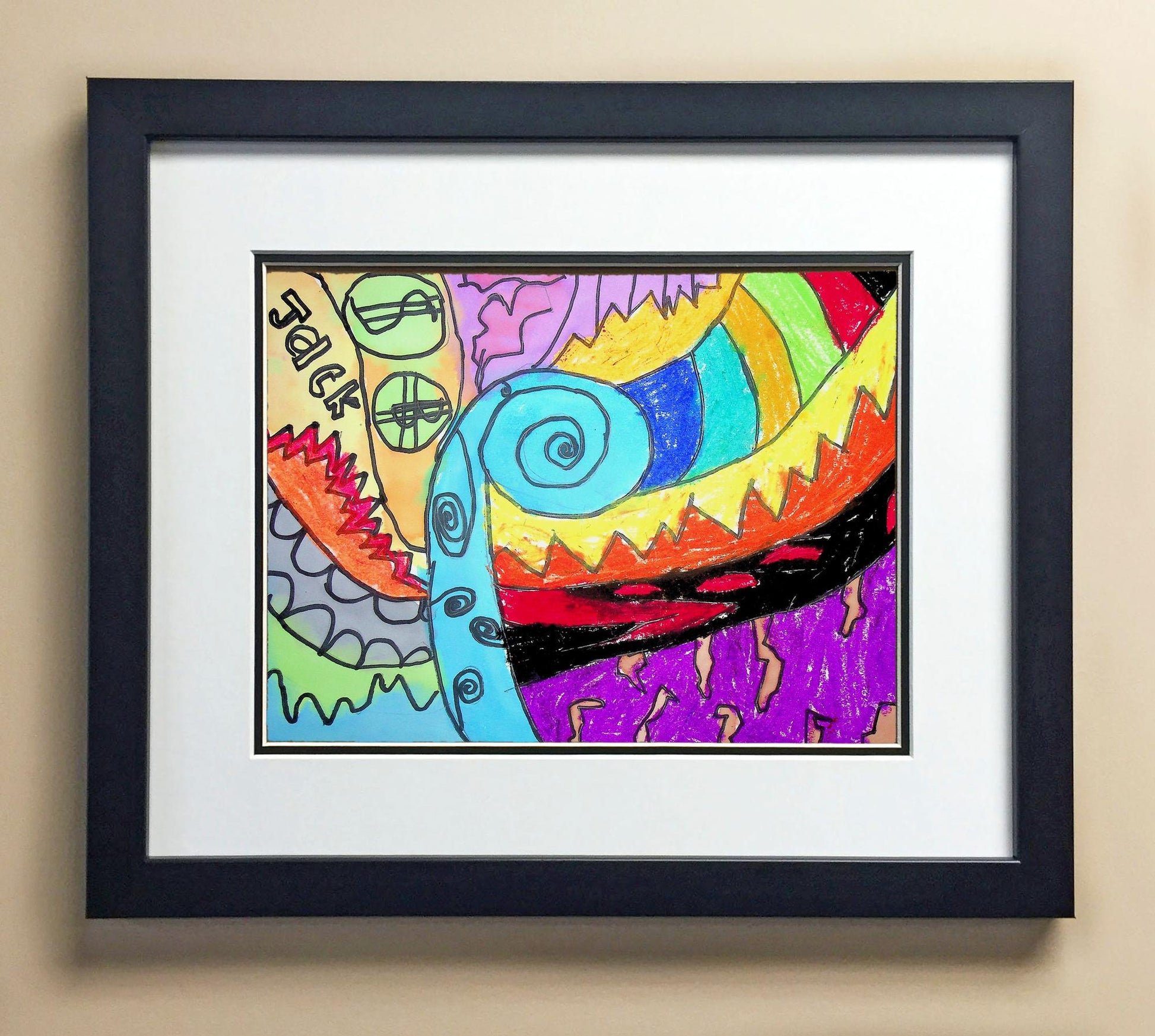 Included with the purchase is the Students Artwork, Frame, double matboard, shatter proof plexiglass, and a ready to hang backerboard with turnbuttons