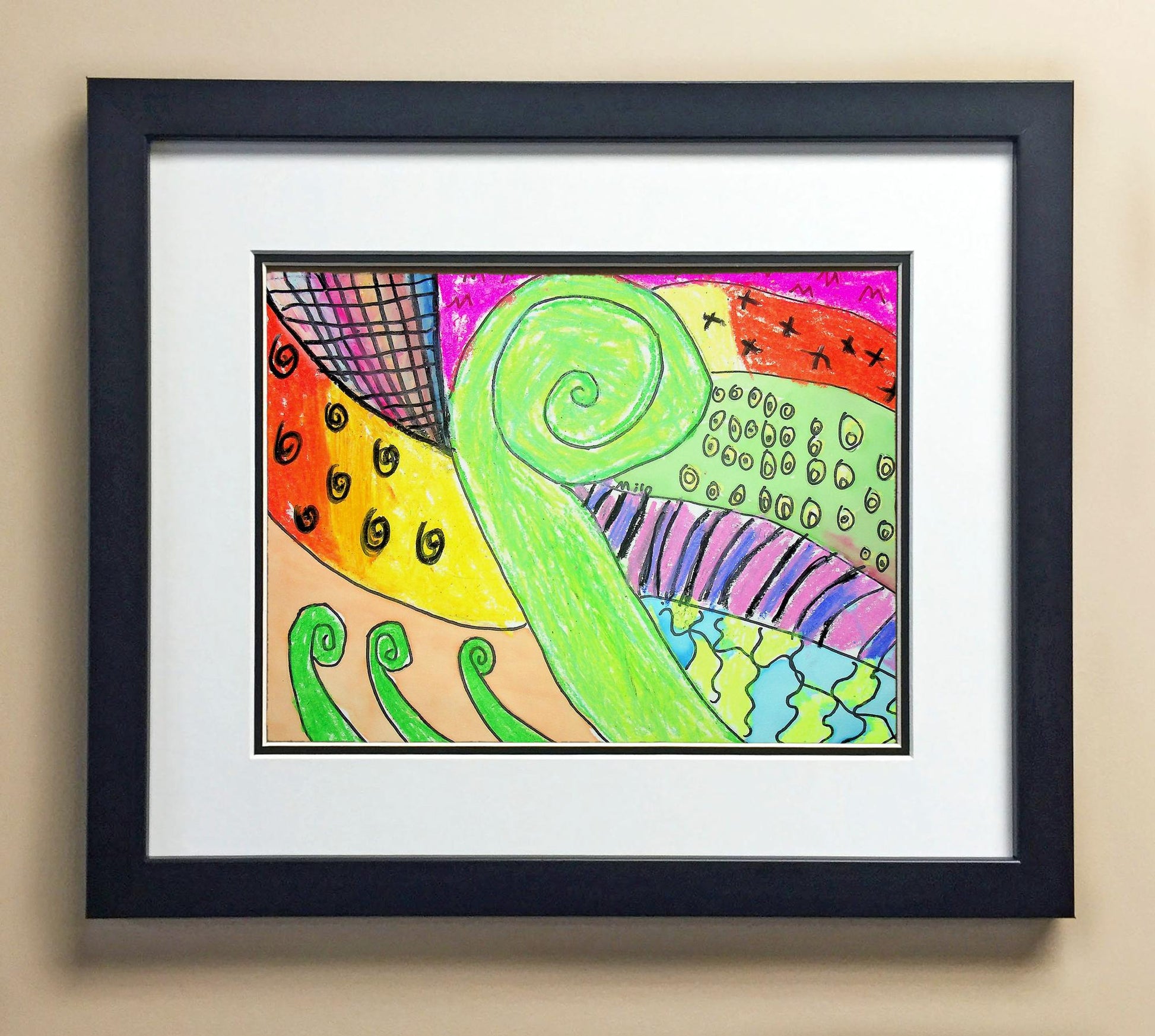 Included with the purchase is the Students Artwork, Frame, double matboard, shatter proof plexiglass, and a ready to hang backerboard with turnbuttons