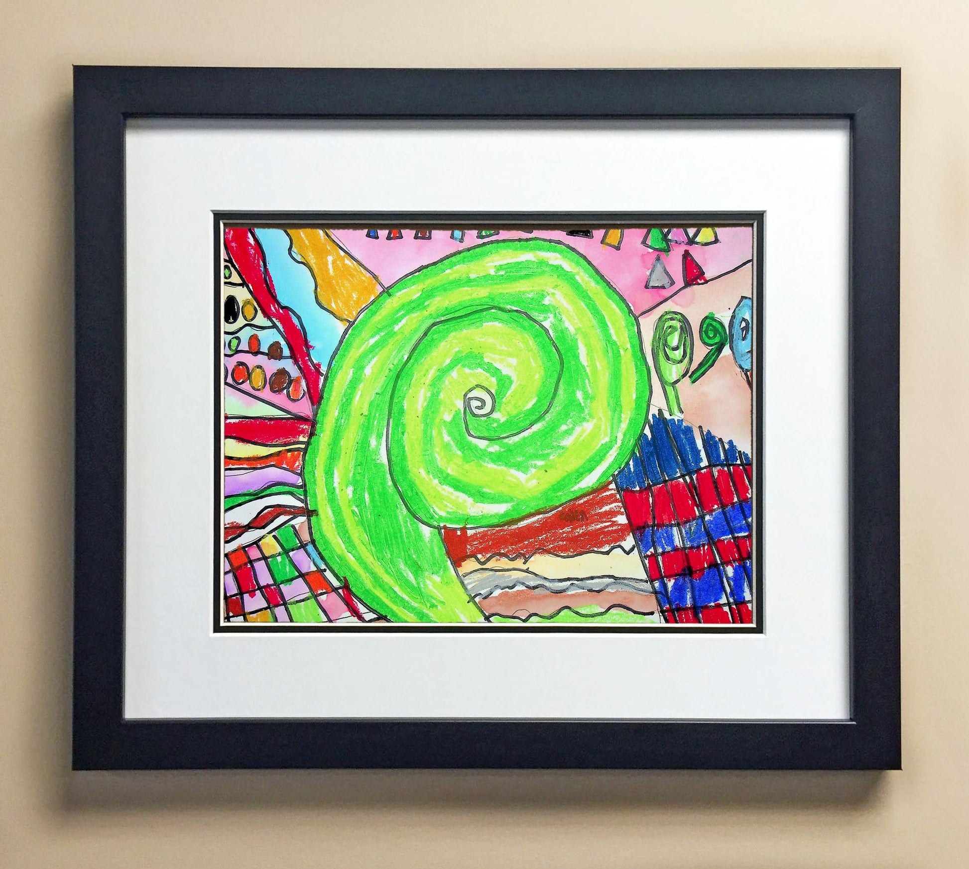 Included with the purchase is the Students Artwork, Frame, double matboard, shatter proof plexiglass, and a ready to hang backerboard with turnbuttons