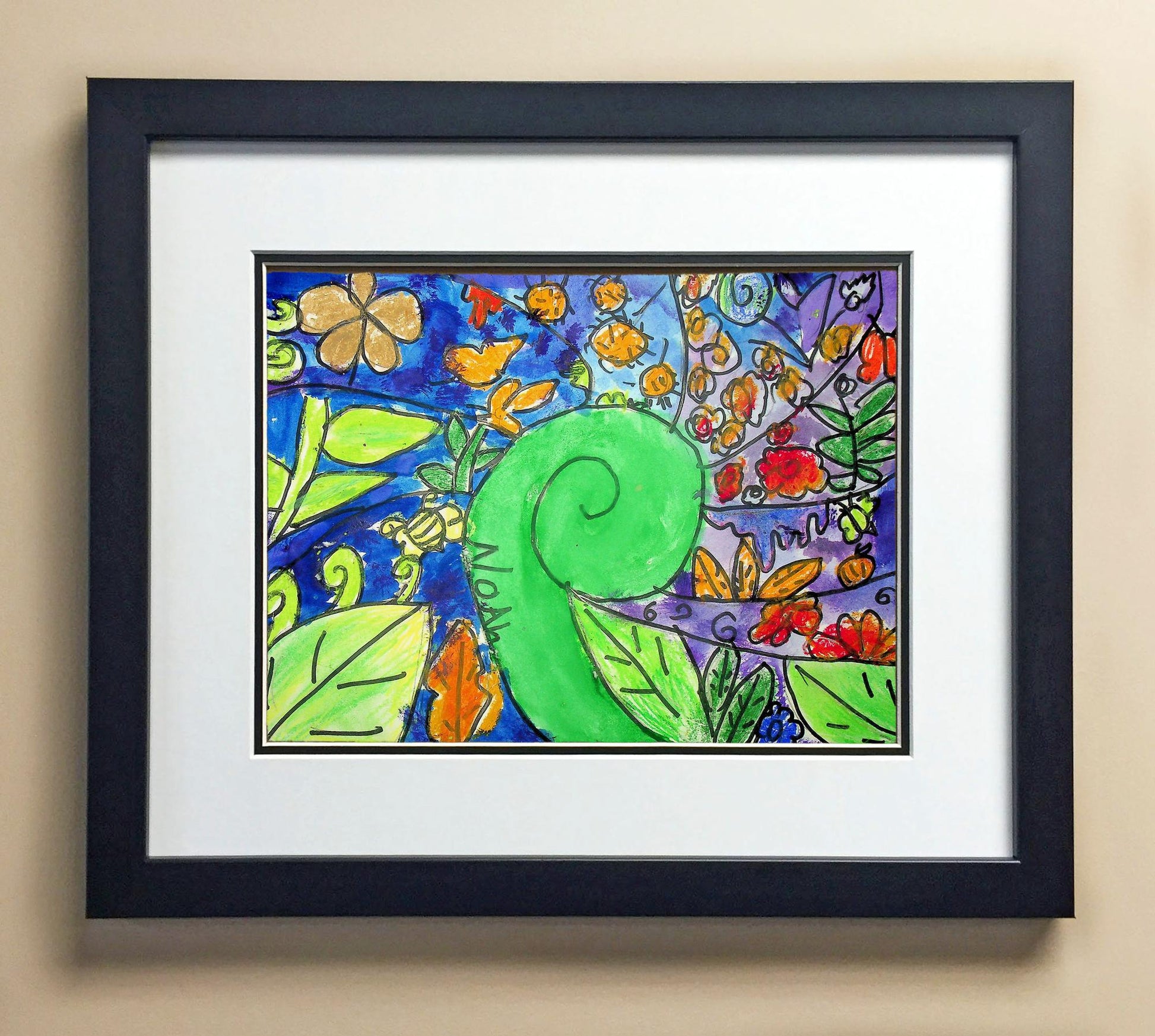 Included with the purchase is the Students Artwork, Frame, double matboard, shatter proof plexiglass, and a ready to hang backerboard with turnbuttons