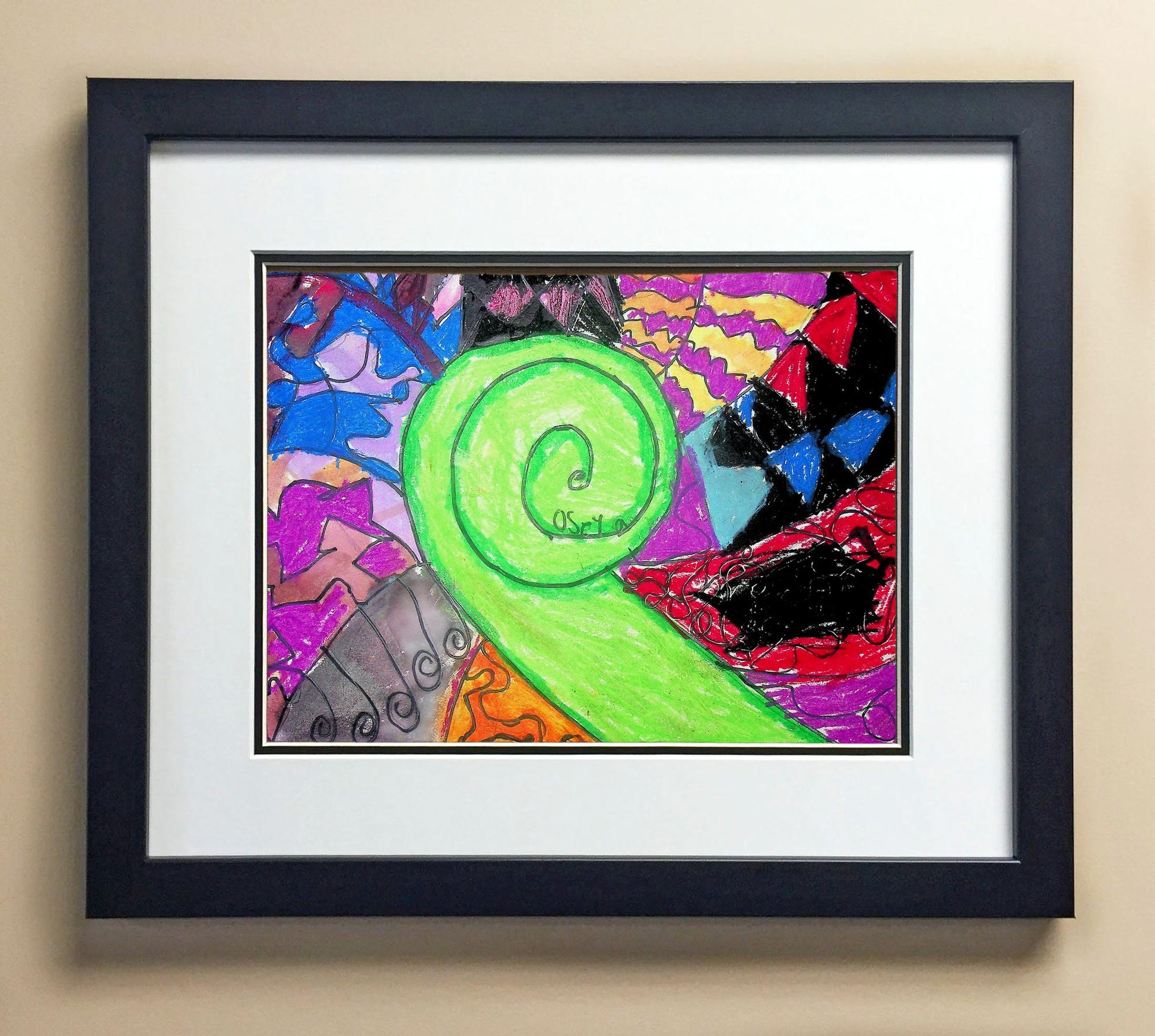 Included with the purchase is the Students Artwork, Frame, double matboard, shatter proof plexiglass, and a ready to hang backerboard with turnbuttons