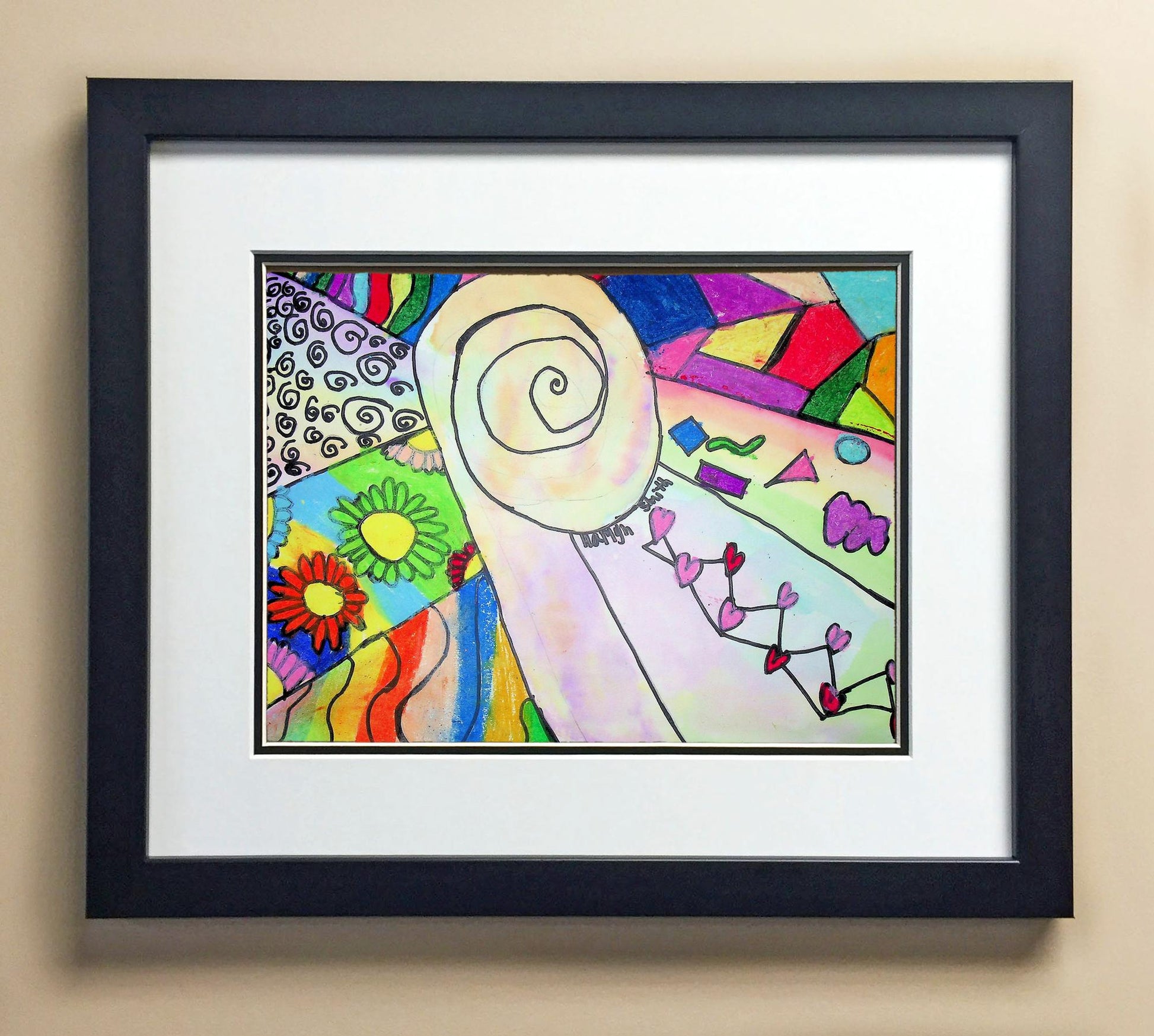 Included with the purchase is the Students Artwork, Frame, double matboard, shatter proof plexiglass, and a ready to hang backerboard with turnbuttons