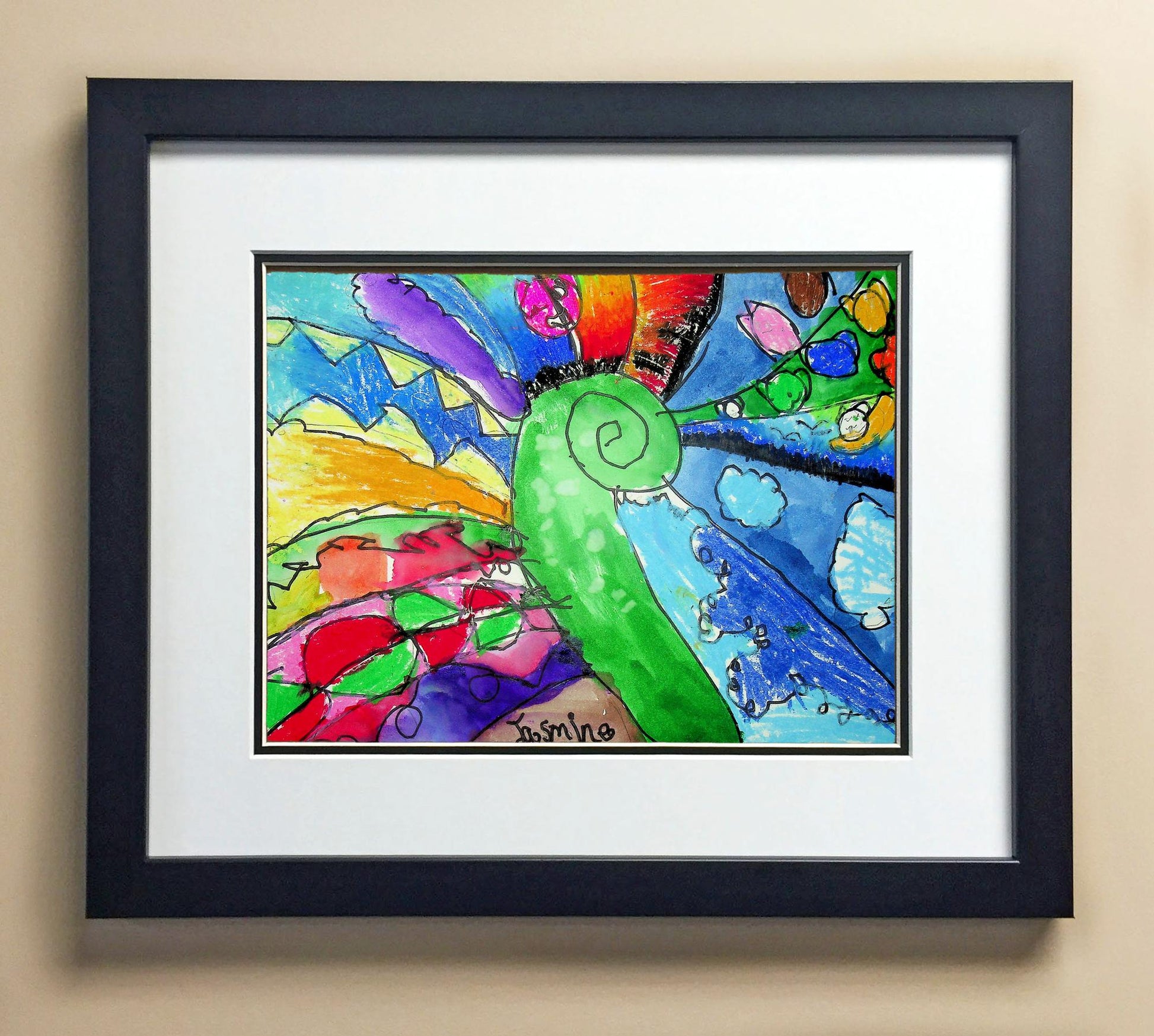Included with the purchase is the Students Artwork, Frame, double matboard, shatter proof plexiglass, and a ready to hang backerboard with turnbuttons
