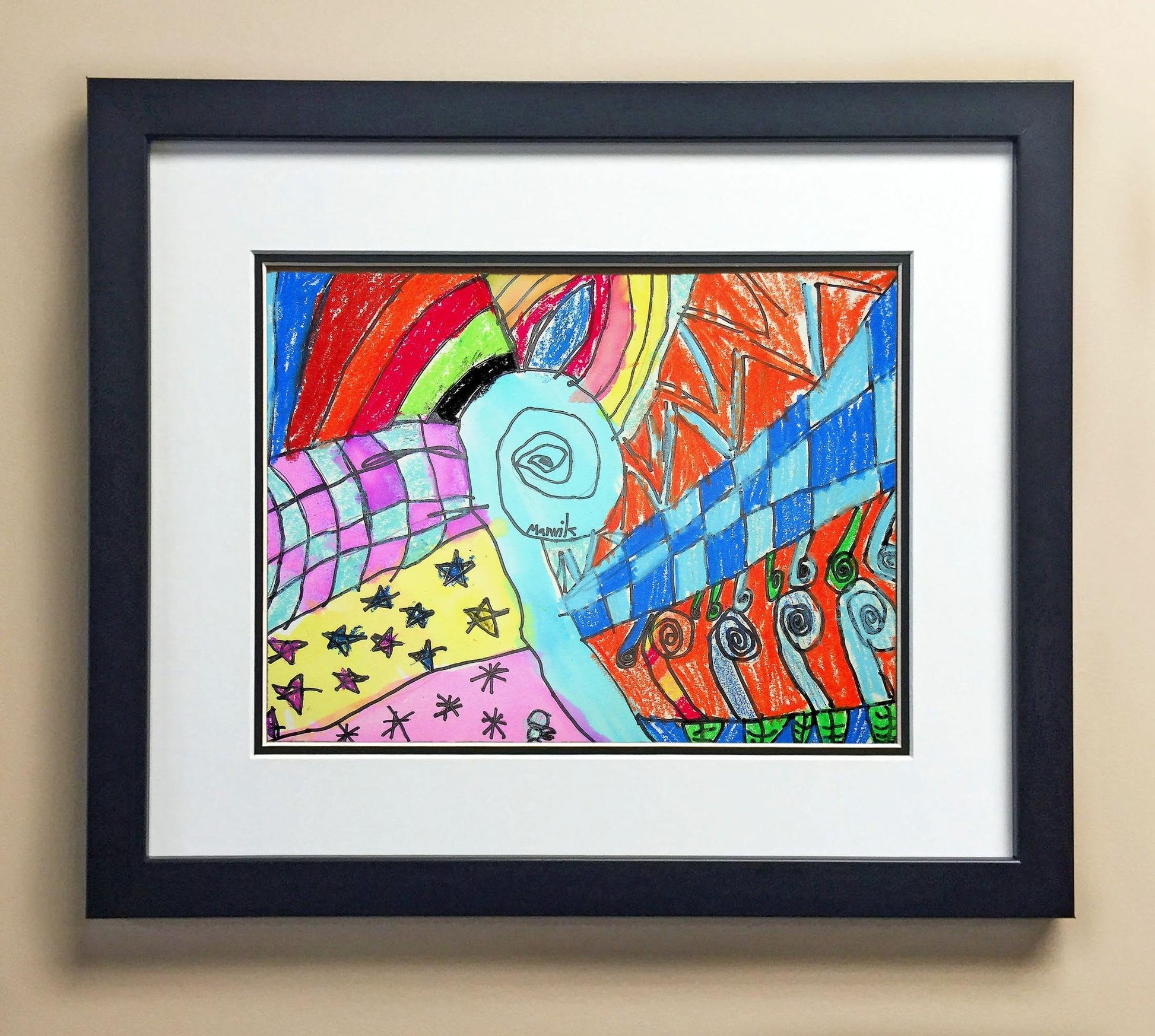 Included with the purchase is the Students Artwork, Frame, double matboard, shatter proof plexiglass, and a ready to hang backerboard with turnbuttons