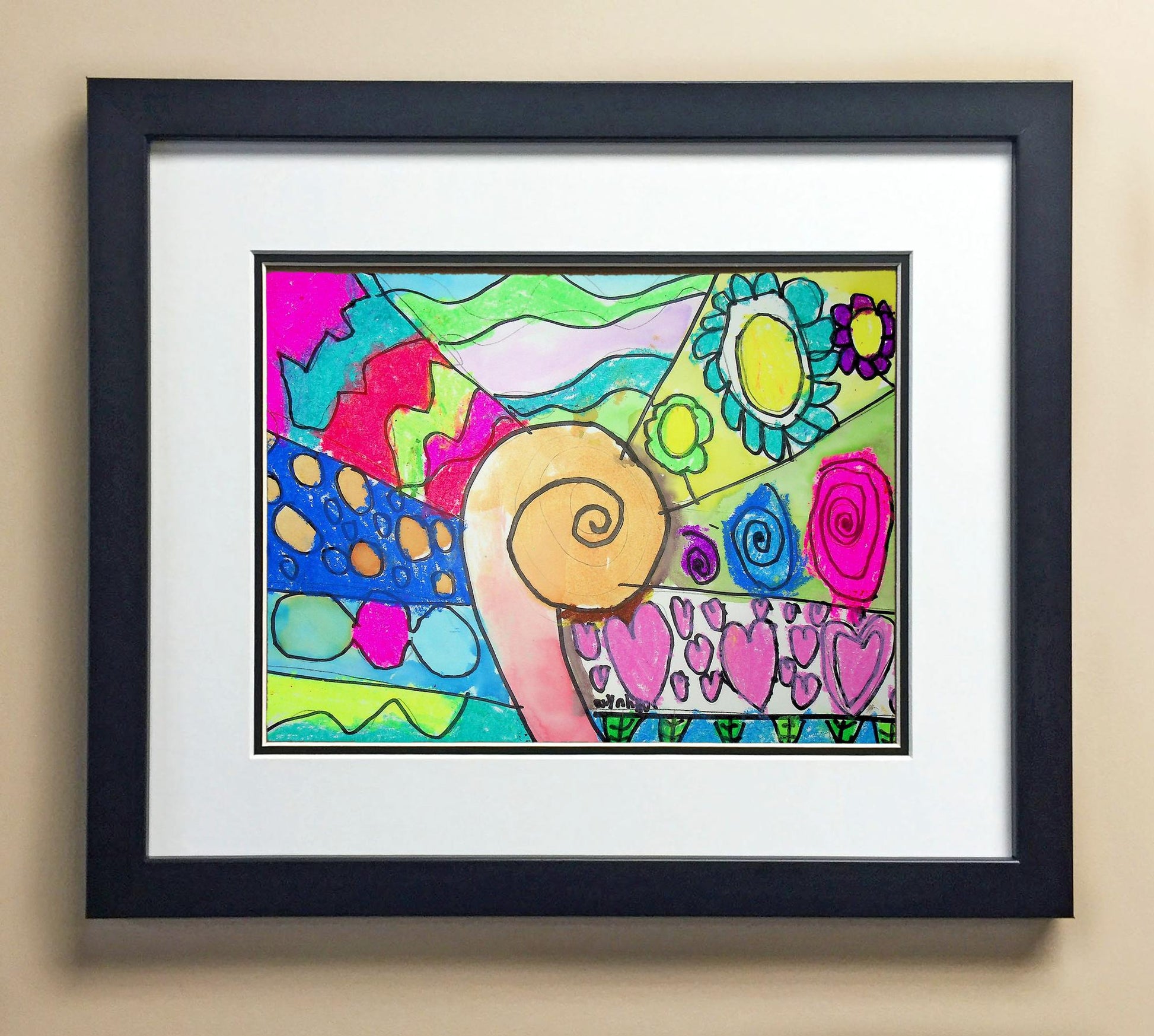 Included with the purchase is the Students Artwork, Frame, double matboard, shatter proof plexiglass, and a ready to hang backerboard with turnbuttons