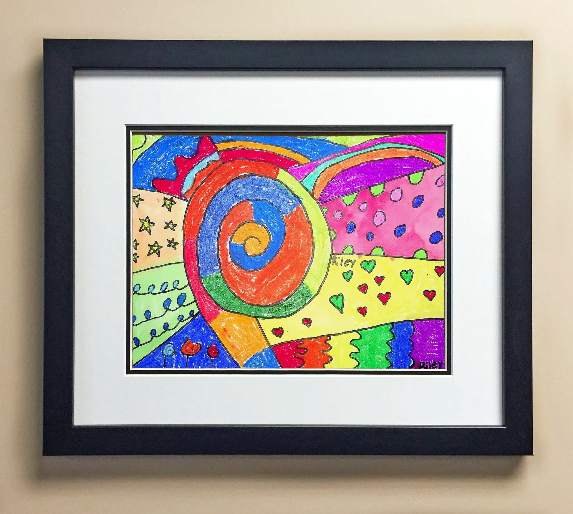 Included with the purchase is the Students Artwork, Frame, double matboard, shatter proof plexiglass, and a ready to hang backerboard with turnbuttons