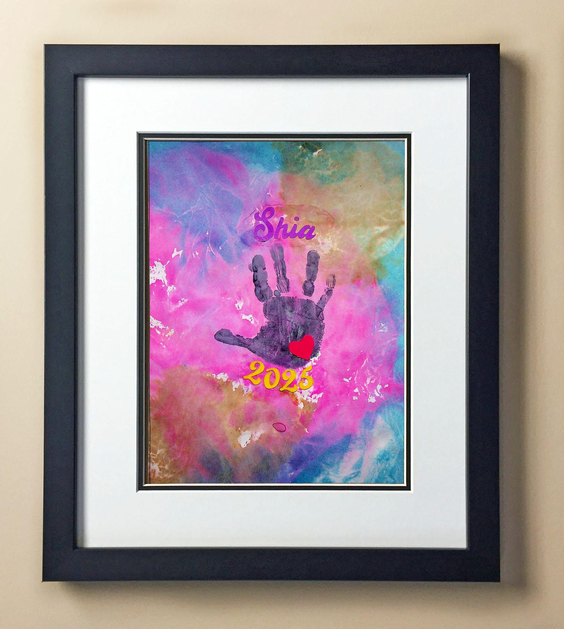 Included with the purchase is the Students Artwork, Frame, double matboard, shatter proof plexiglass, and a ready to hang backerboard with turnbuttons