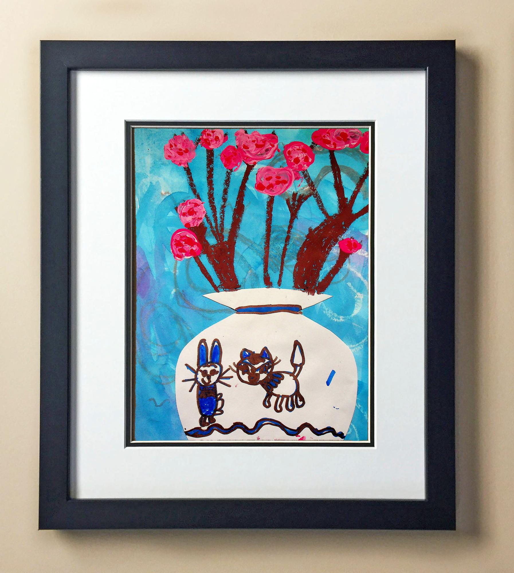 Included with the purchase is the Students Artwork, Frame, double matboard, shatter proof plexiglass, and a ready to hang backerboard with turnbuttons