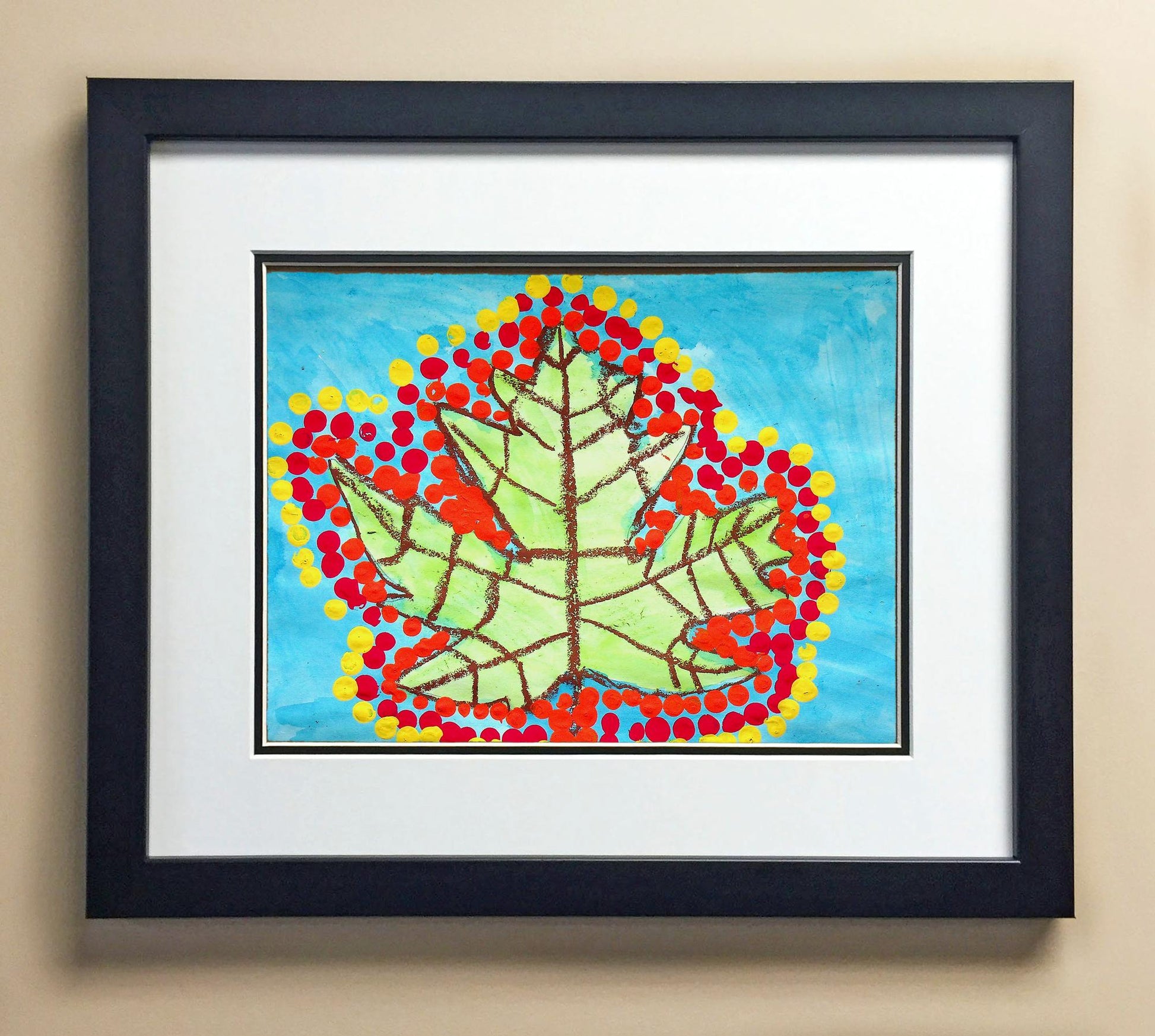 Included with the purchase is the Students Artwork, Frame, double matboard, shatter proof plexiglass, and a ready to hang backerboard with turnbuttons