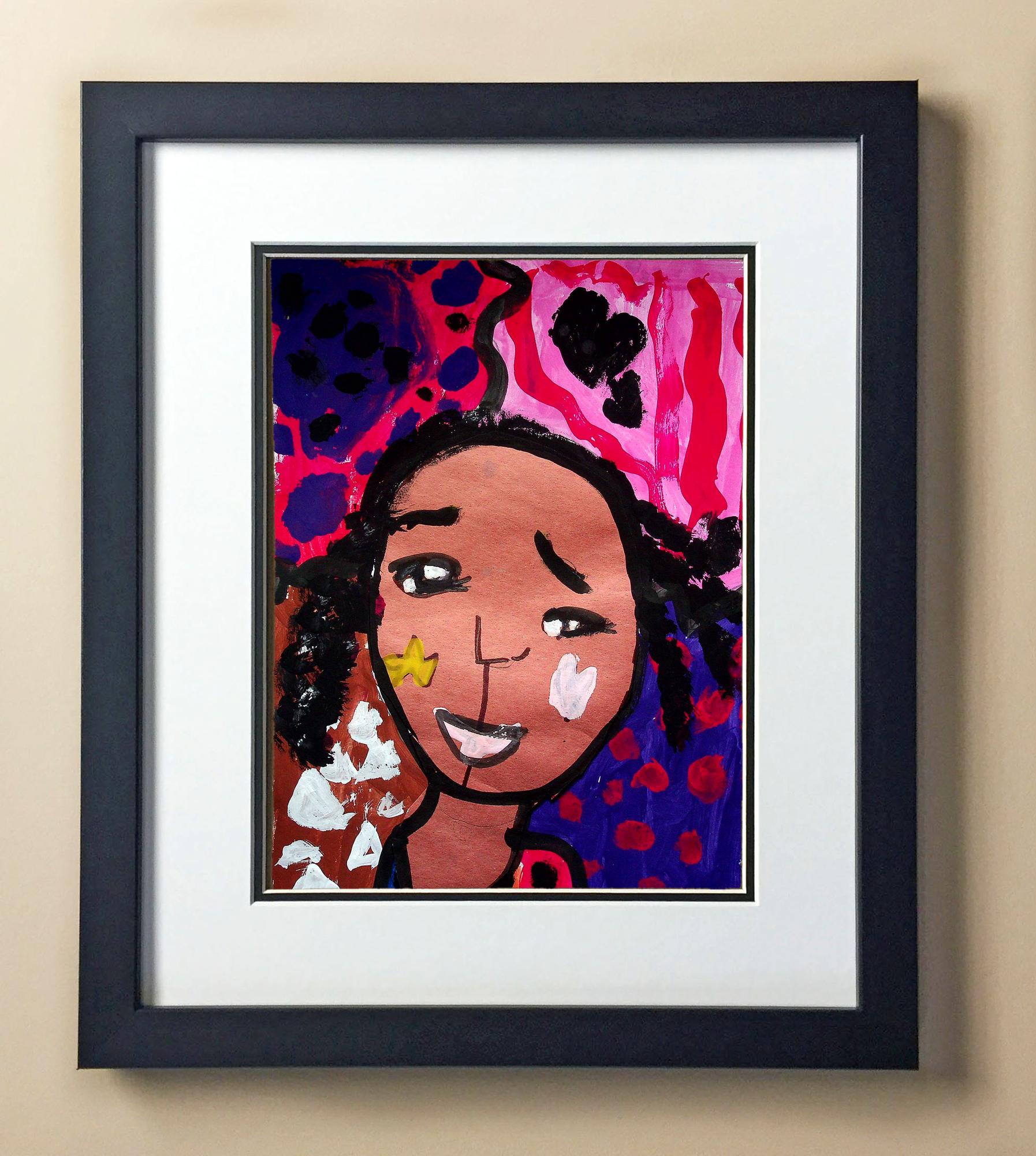 Included with the purchase is the Students Artwork, Frame, double matboard, shatter proof plexiglass, and a ready to hang backerboard with turnbuttons