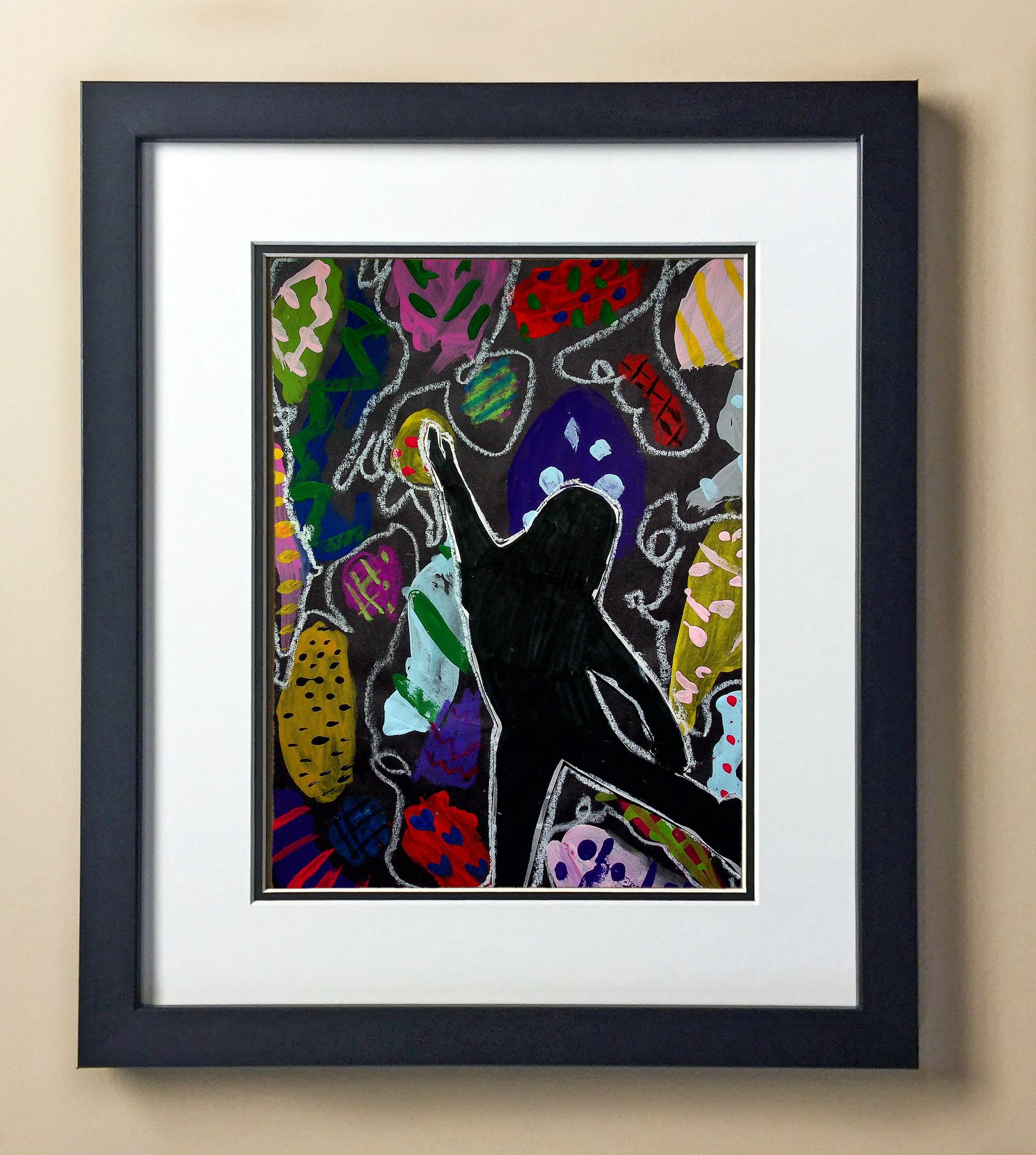 Included with the purchase is the Students Artwork, Frame, double matboard, shatter proof plexiglass, and a ready to hang backerboard with turnbuttons
