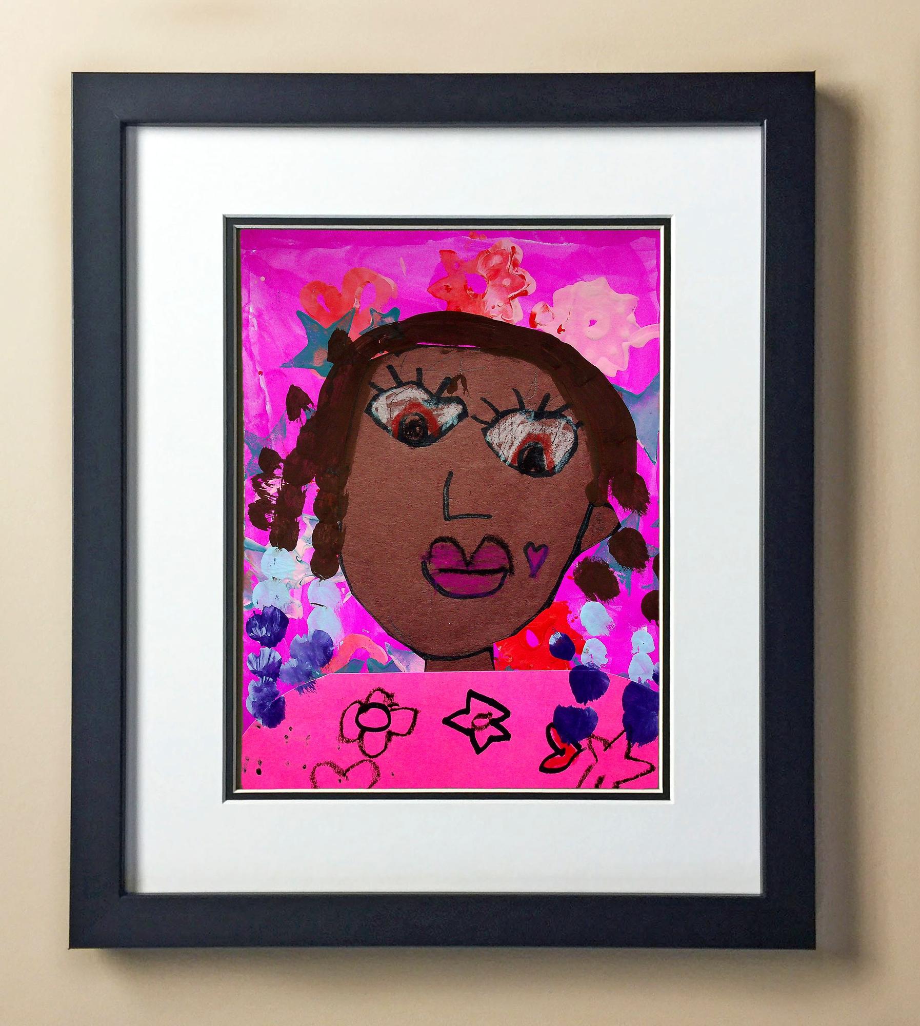 Included with the purchase is the Students Artwork, Frame, double matboard, shatter proof plexiglass, and a ready to hang backerboard with turnbuttons