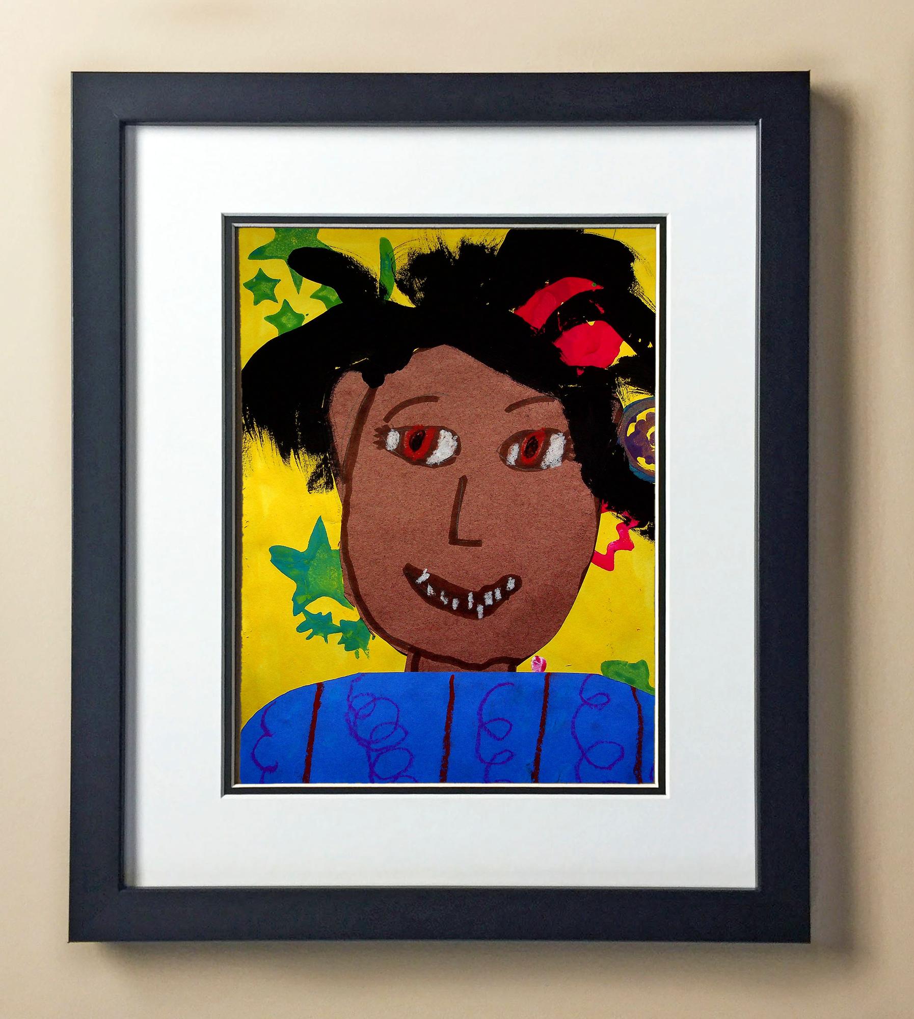 Included with the purchase is the Students Artwork, Frame, double matboard, shatter proof plexiglass, and a ready to hang backerboard with turnbuttons