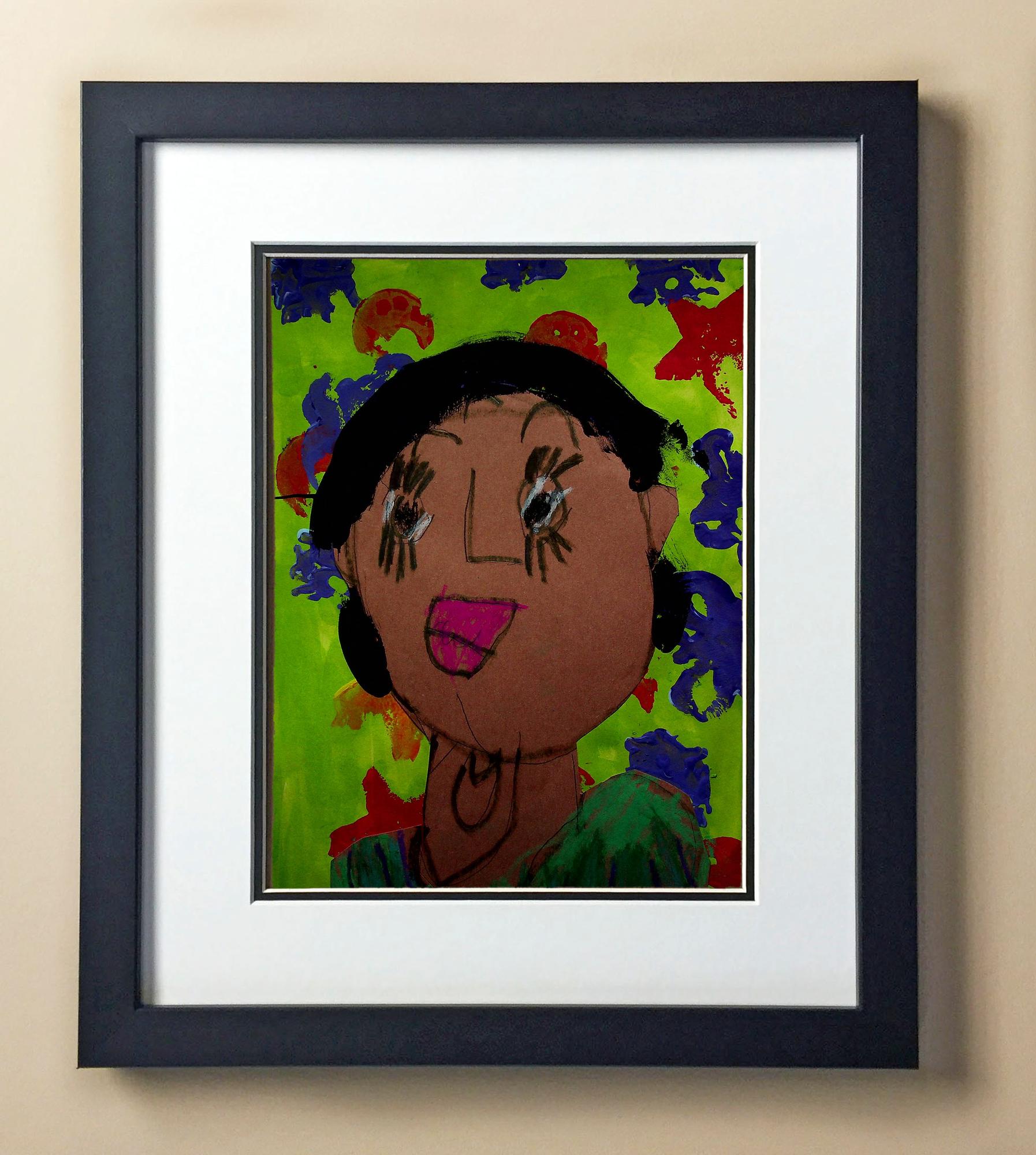 Included with the purchase is the Students Artwork, Frame, double matboard, shatter proof plexiglass, and a ready to hang backerboard with turnbuttons