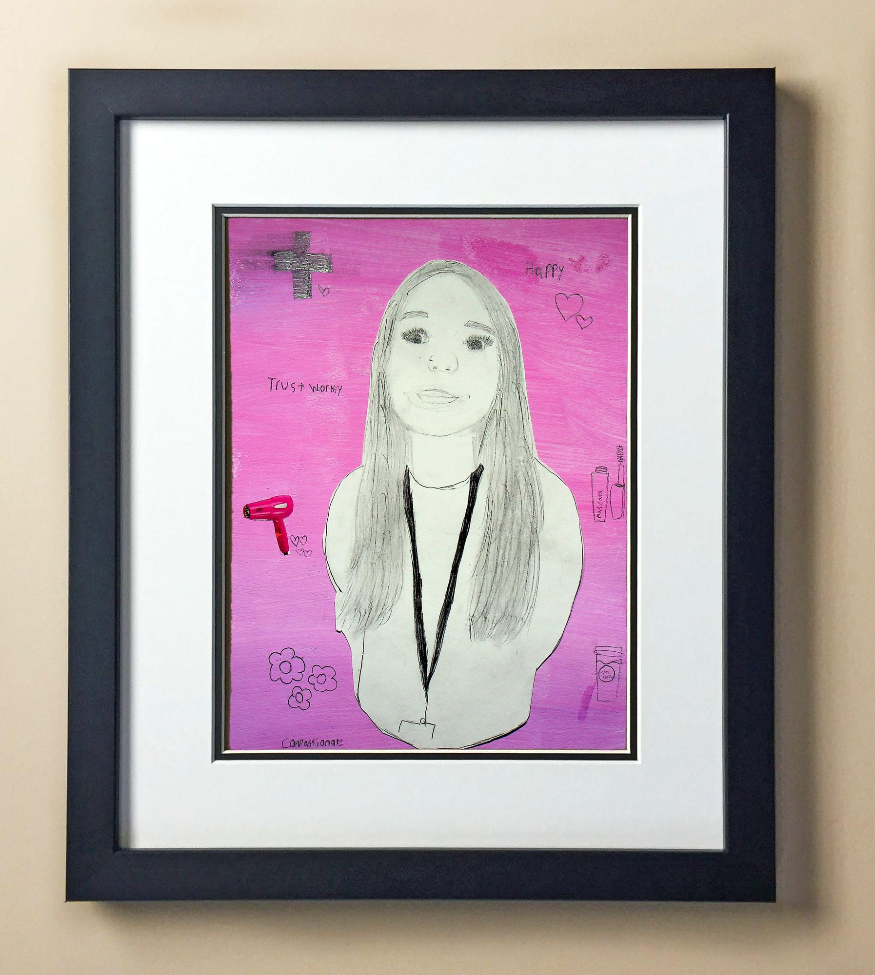 Included with the purchase is the Students Artwork, Frame, double matboard, shatter proof plexiglass, and a ready to hang backerboard with turnbuttons