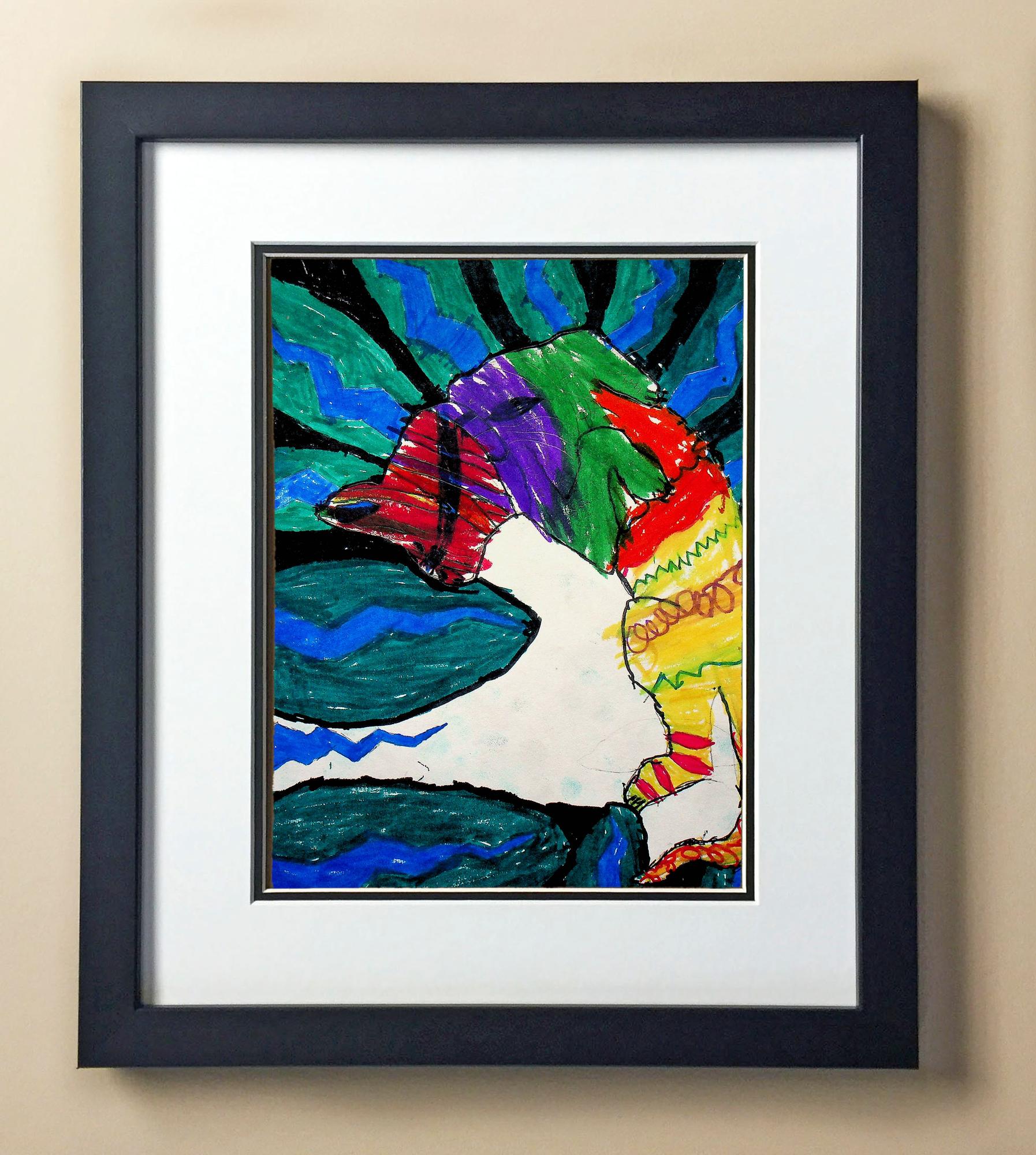 Included with the purchase is the Students Artwork, Frame, double matboard, shatter proof plexiglass, and a ready to hang backerboard with turnbuttons