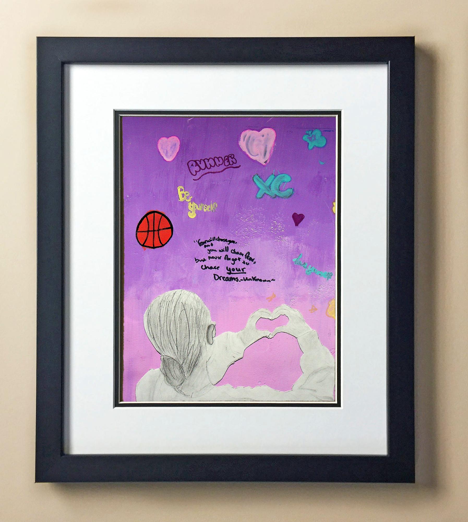 Included with the purchase is the Students Artwork, Frame, double matboard, shatter proof plexiglass, and a ready to hang backerboard with turnbuttons