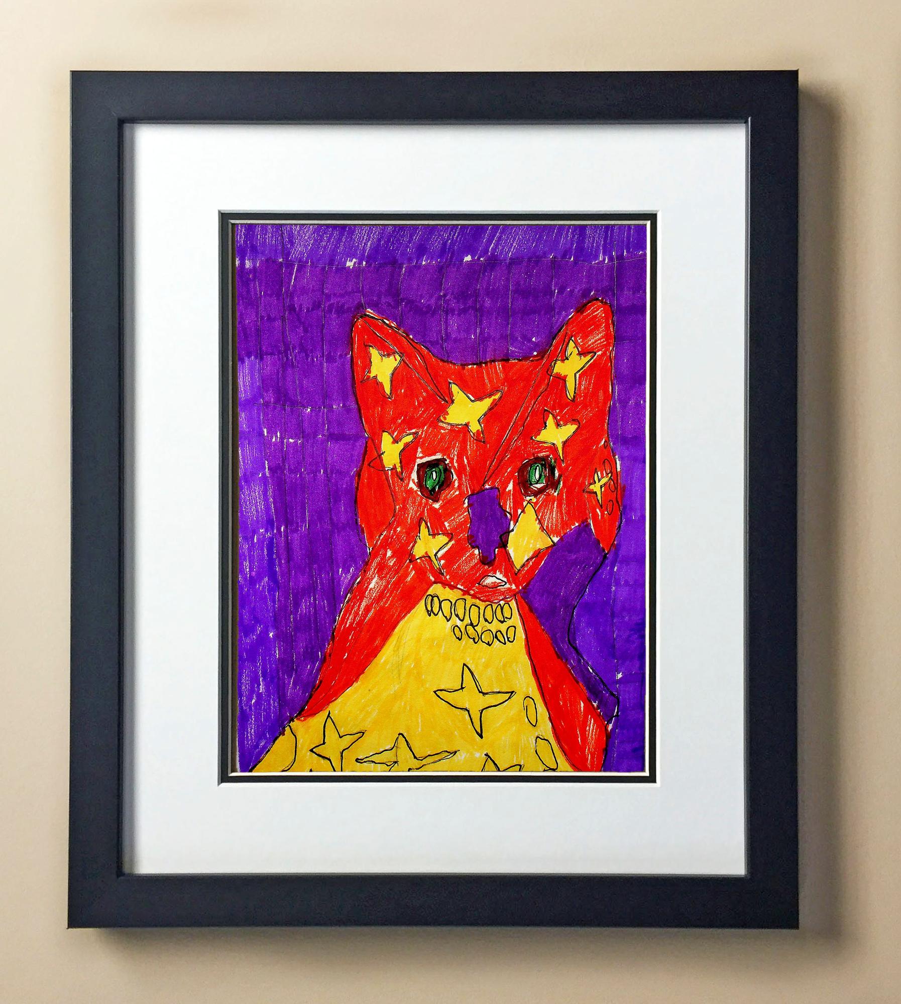 Included with the purchase is the Students Artwork, Frame, double matboard, shatter proof plexiglass, and a ready to hang backerboard with turnbuttons