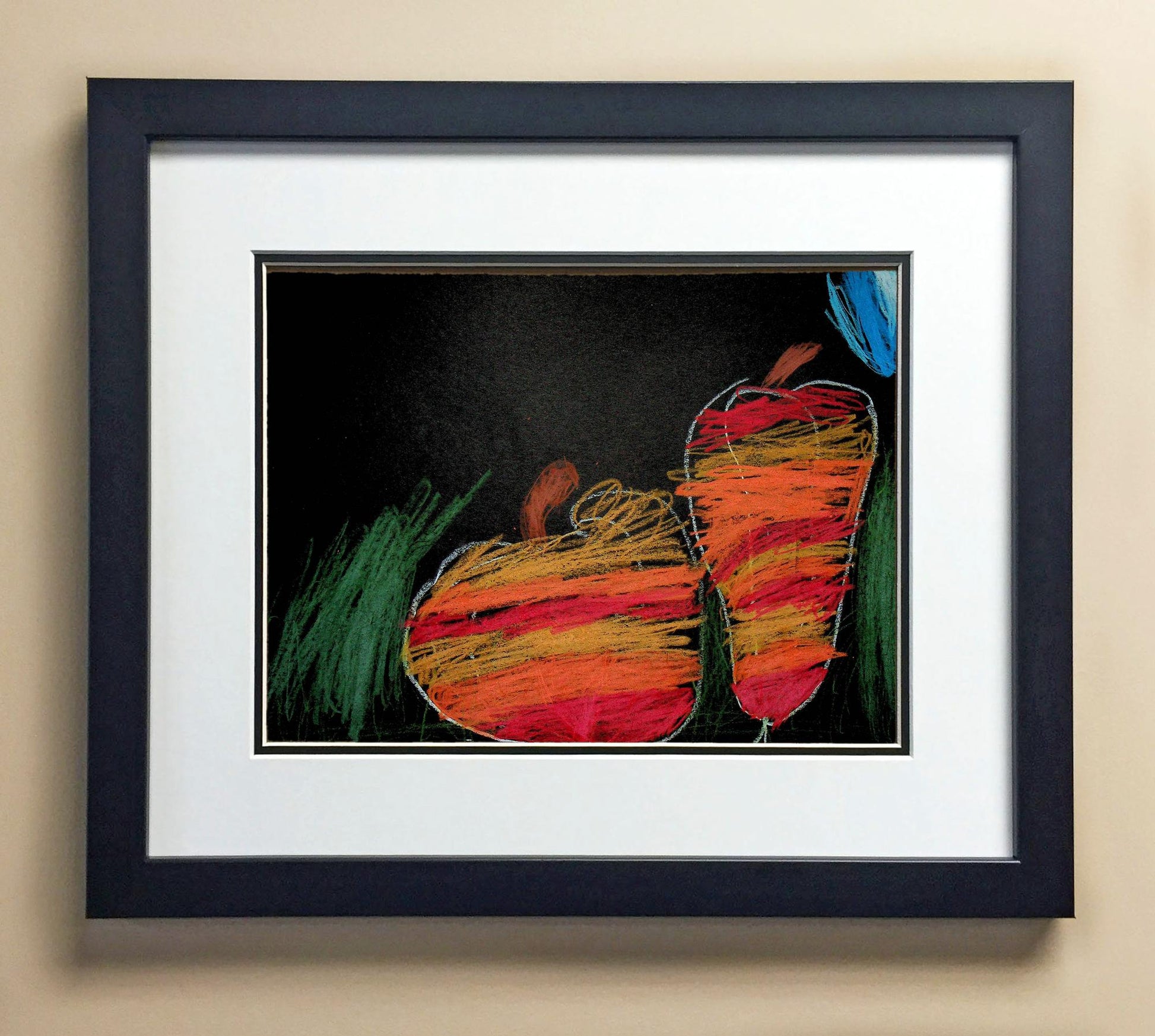 Included with the purchase is the Students Artwork, Frame, double matboard, shatter proof plexiglass, and a ready to hang backerboard with turnbuttons