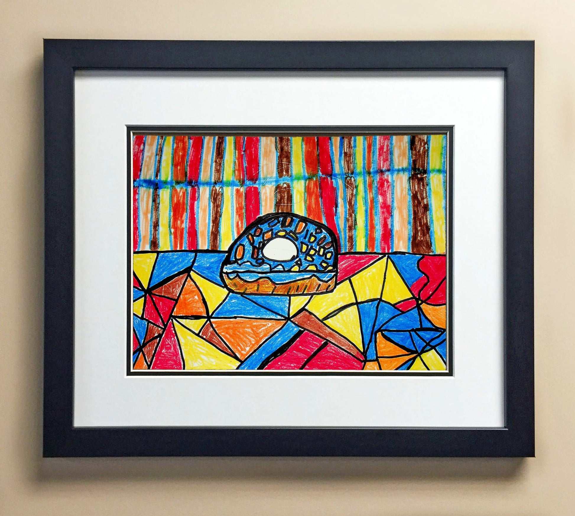 Included with the purchase is the Students Artwork, Frame, double matboard, shatter proof plexiglass, and a ready to hang backerboard with turnbuttons