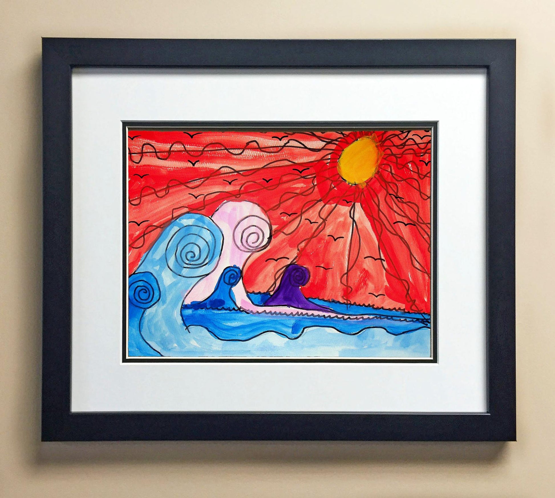 Included with the purchase is the Students Artwork, Frame, double matboard, shatter proof plexiglass, and a ready to hang backerboard with turnbuttons