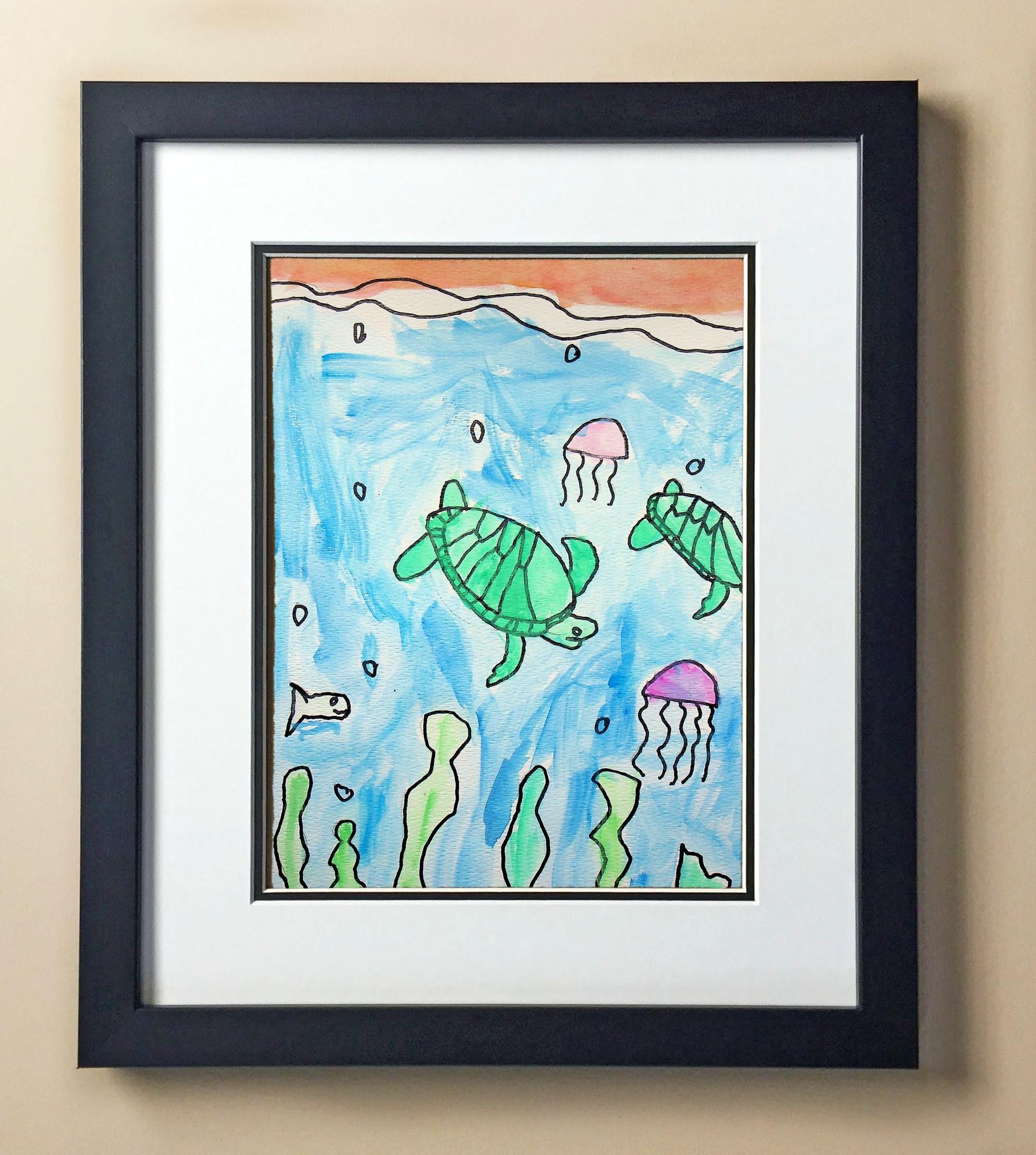 Included with the purchase is the Students Artwork, Frame, double matboard, shatter proof plexiglass, and a ready to hang backerboard with turnbuttons