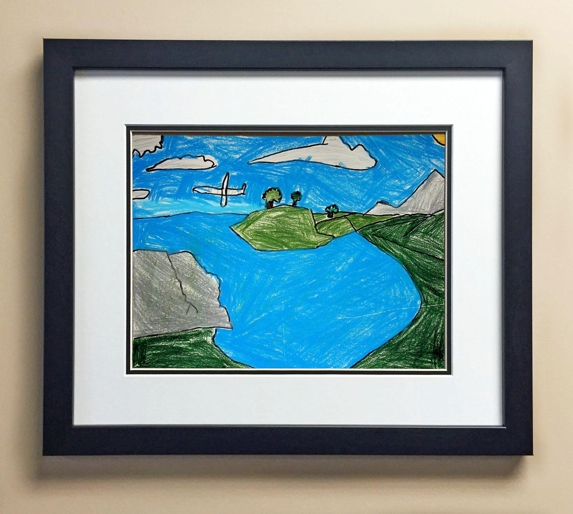 Included with the purchase is the Students Artwork, Frame, double matboard, shatter proof plexiglass, and a ready to hang backerboard with turnbuttons