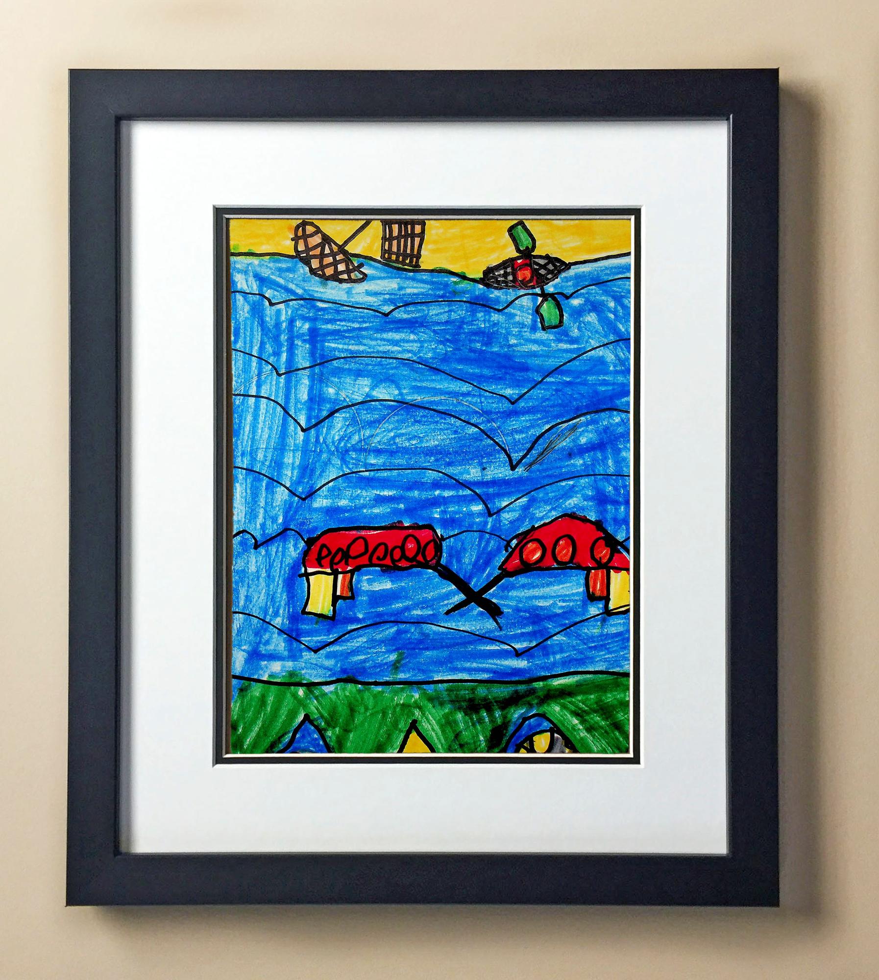 Included with the purchase is the Students Artwork, Frame, double matboard, shatter proof plexiglass, and a ready to hang backerboard with turnbuttons