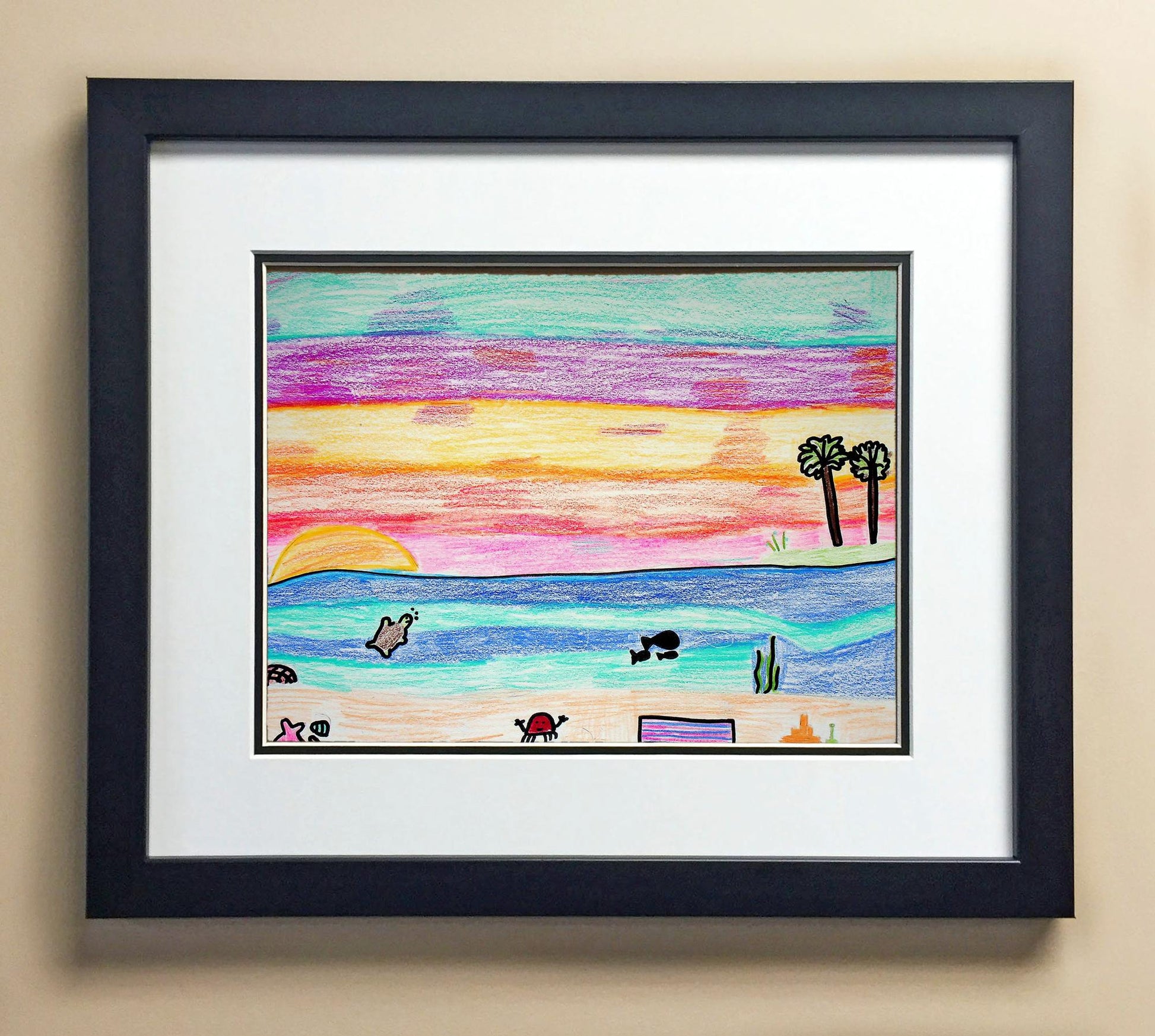 Included with the purchase is the Students Artwork, Frame, double matboard, shatter proof plexiglass, and a ready to hang backerboard with turnbuttons