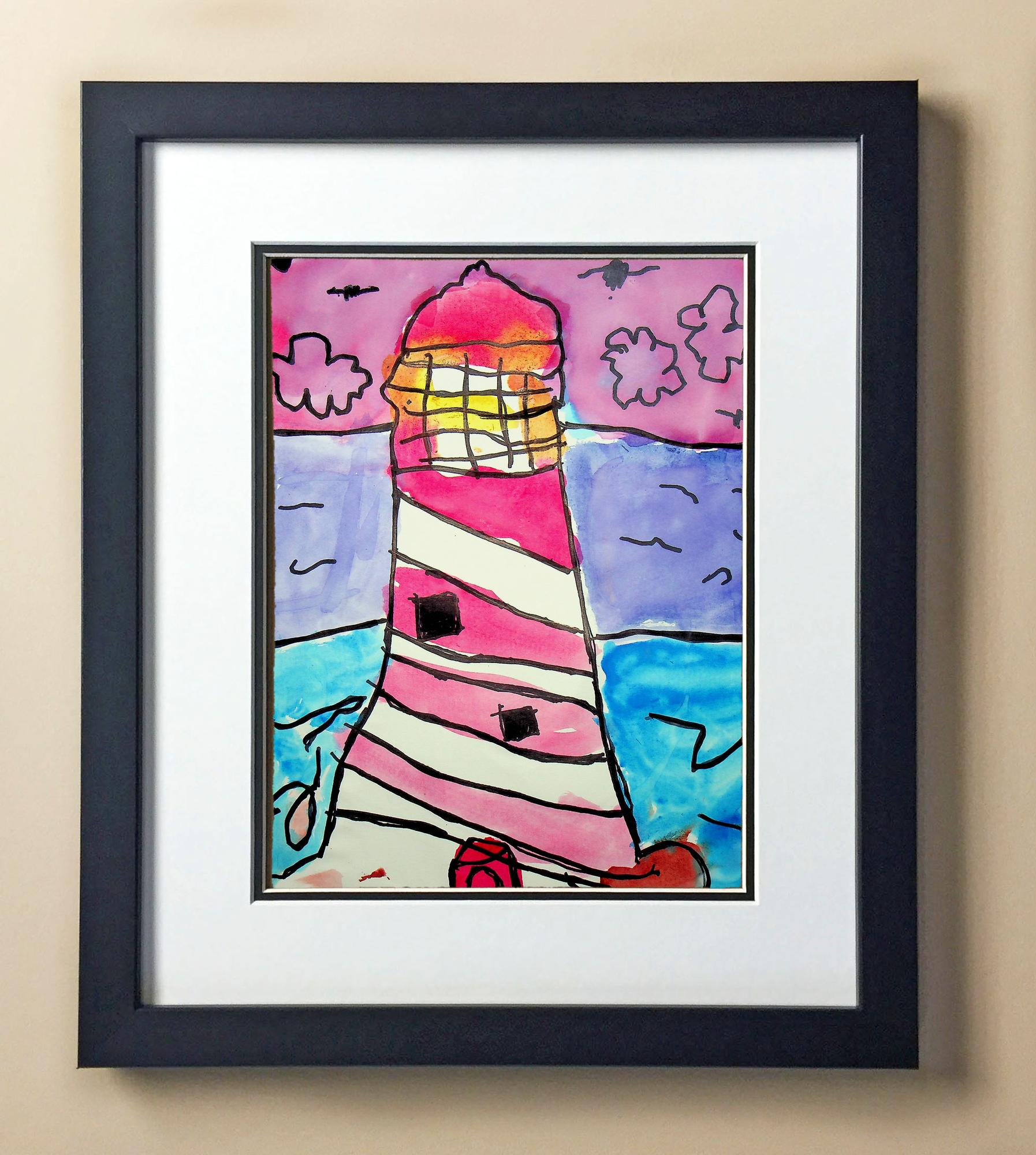 Included with the purchase is the Students Artwork, Frame, double matboard, shatter proof plexiglass, and a ready to hang backerboard with turnbuttons