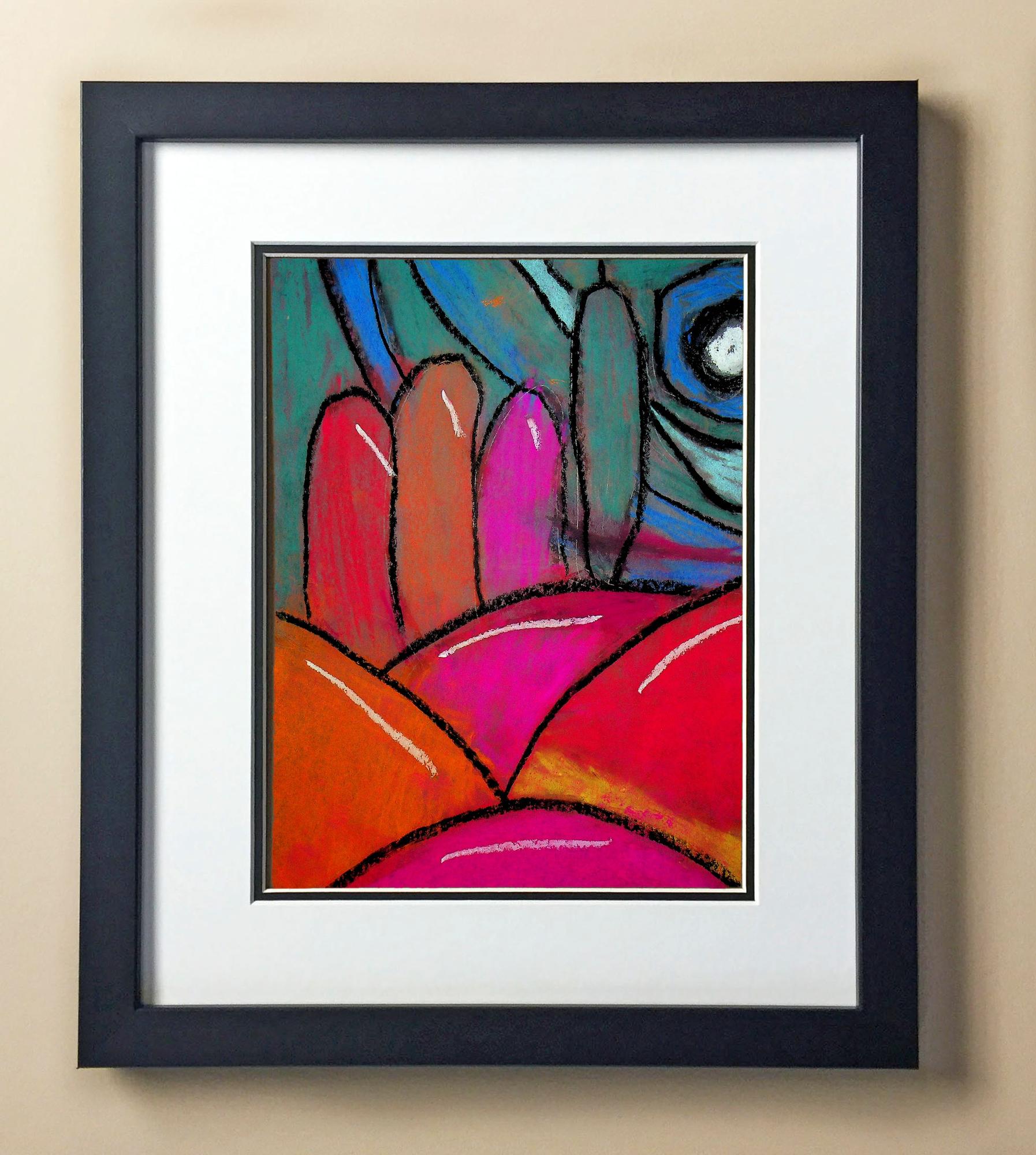 Included with the purchase is the Students Artwork, Frame, double matboard, shatter proof plexiglass, and a ready to hang backerboard with turnbuttons