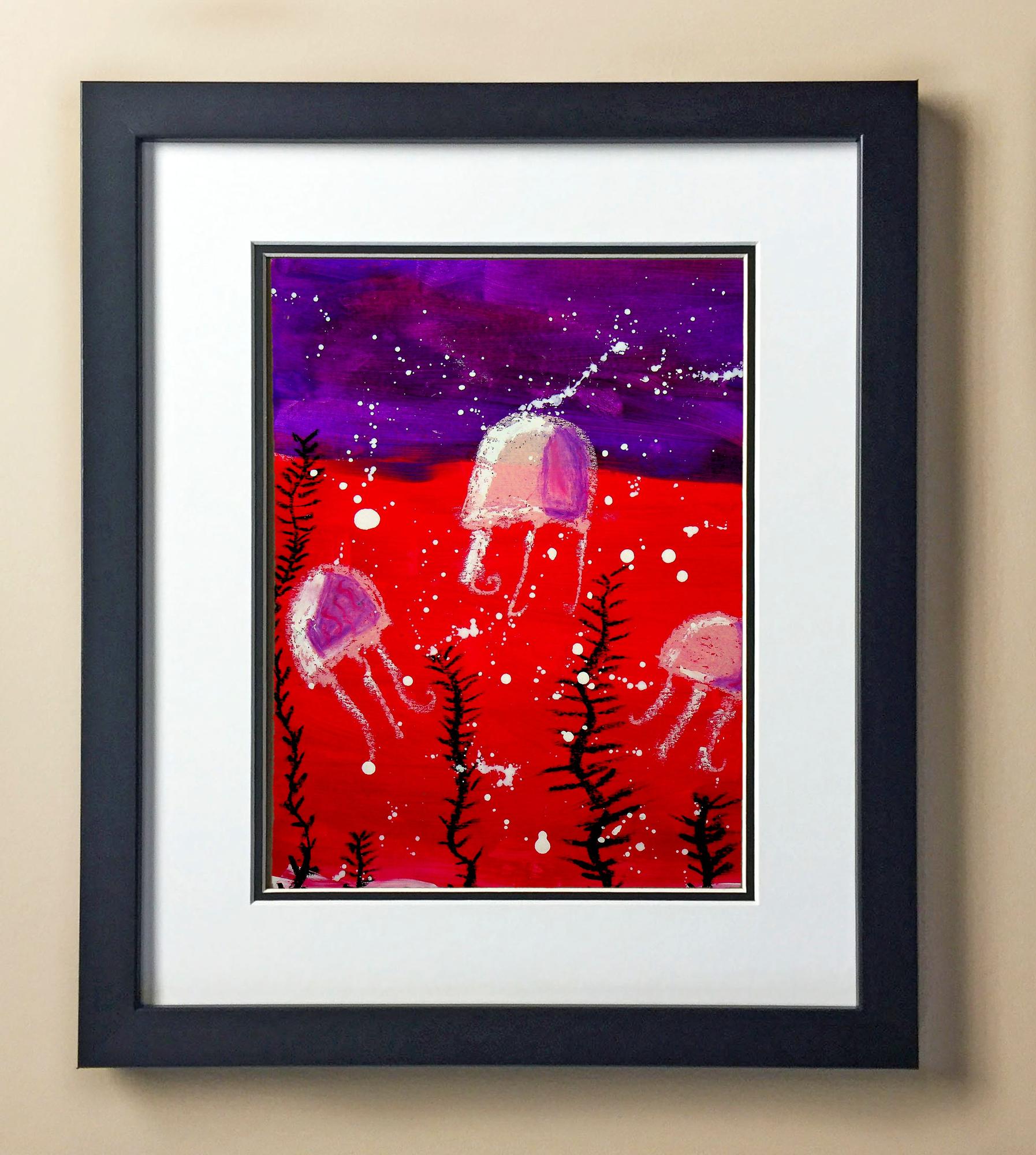 Included with the purchase is the Students Artwork, Frame, double matboard, shatter proof plexiglass, and a ready to hang backerboard with turnbuttons