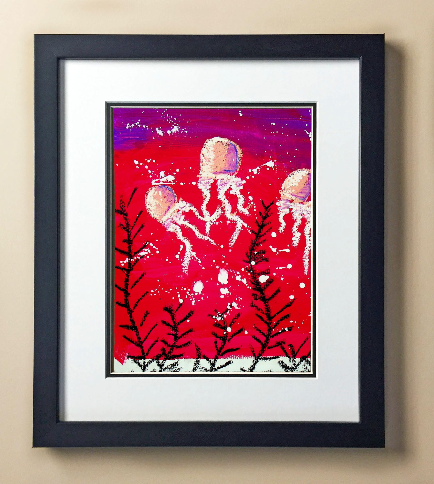 Included with the purchase is the Students Artwork, Frame, double matboard, shatter proof plexiglass, and a ready to hang backerboard with turnbuttons