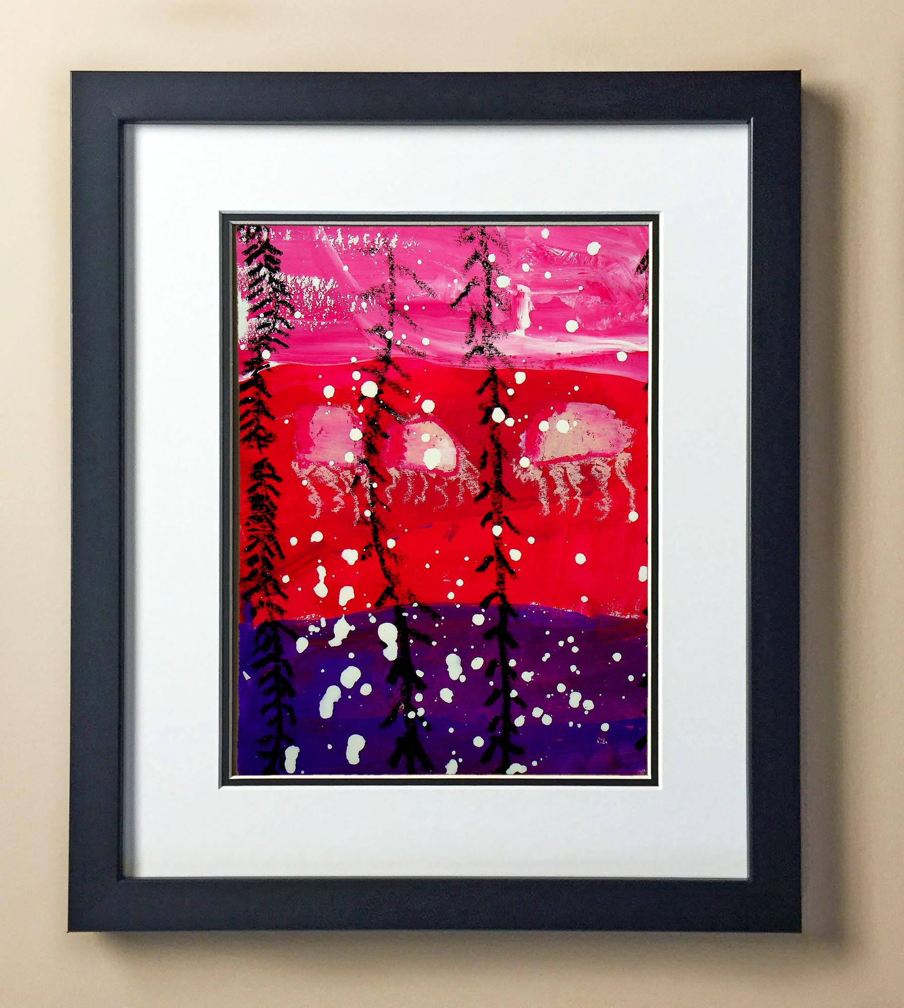 Included with the purchase is the Students Artwork, Frame, double matboard, shatter proof plexiglass, and a ready to hang backerboard with turnbuttons